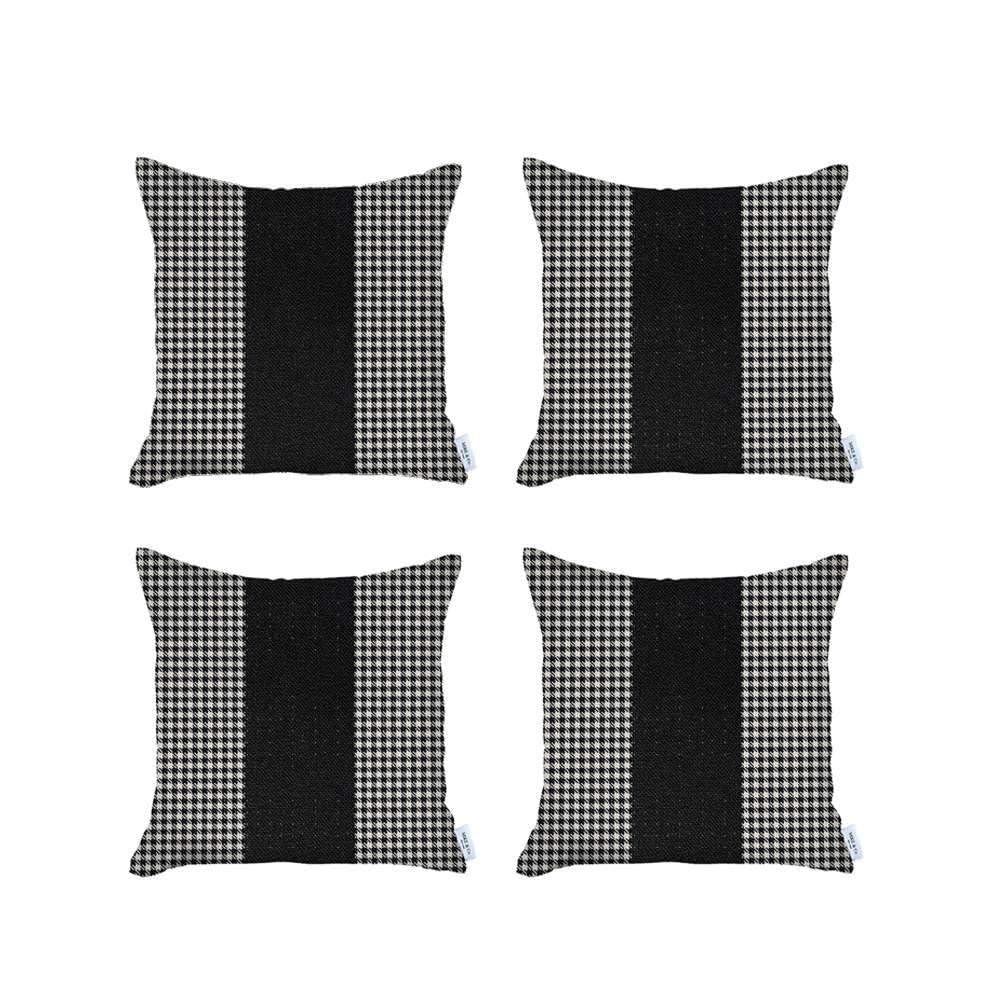 The set of four 18 x 18 white and black houndstooth zippered handmade polyester throw pillow is the perfect decorative accessory for your home. These great looking soft decorative pillows are expertly made of durable and long lasting polyester in a white and black coloration. For anyone that loves to decorate or accent their space with color and texture. A great decorative accessory for your favorite chair, to accent your sofa or to use as part of your bed ensemble. Features. Features a traditional houndstooth design. Hidden zipper closure provides a clean and seamless look. Inserts are included. Set of four soft and beautiful polyester decorative pillow covers with insert/fill. This product is OekoTex certified to limit harmful substances in textiles for safety. Cushionlike pillows that are put in the living room, lounge, or bedroom to add more decor and softness to your home. Set of 4Specifications. EPP Compliant No. ITTO Compliant No. Reclaimed Wood No. Closure Type Zipper. Cover Material Polyester. Decorative Additions No Decorative Addition. Fill Material Polyfill. Holiday or Occasion No Holiday. Insert Included Yes. Number of Pieces Included 4. OekoTex Certified Yes. OekoTex Standard 100 Certified Yes. Textile Outdoor Use No. Pattern Houndstooth. Pillow Type Throw. Throw Pillow Type Pillow Cover and Insert. Purposeful Distressing Type No Distressing. Removable Cover Yes. Reversible No. Shape Square. Washing Method Machine wash. Room Living Room. Size 18 X 18. Pillow Set Yes. Variation Varying Set. Material Polyester. Finishing Technique Handmade. Color White and Black. Country of Origin Turkey. Dimension 7.16 H x 18 W x 18 D. Weight 6.32 lbs