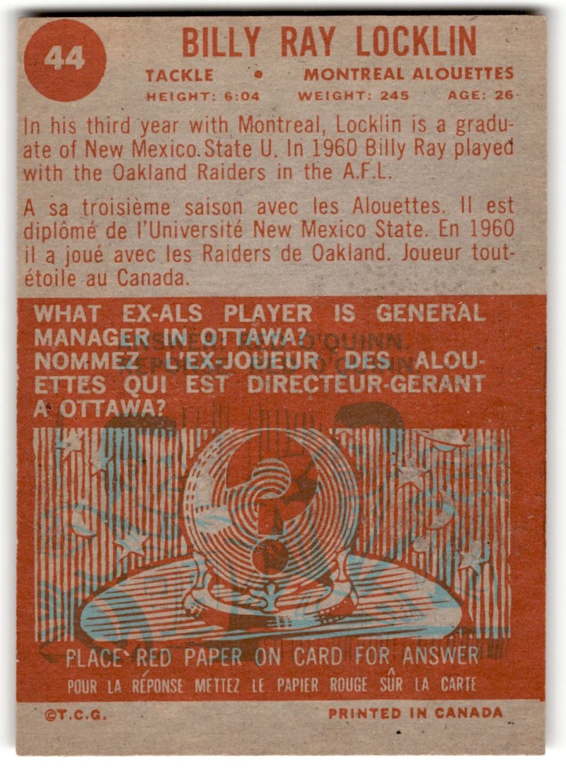 | 1963 Topps CFL Billy Ray Locklin #44 B Montreal Alouettes |