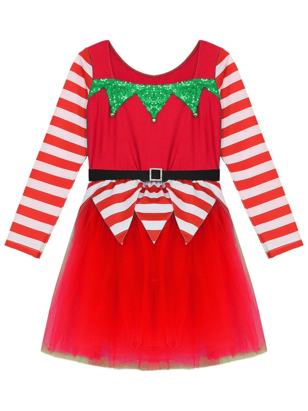 Designed with sequins and jingle bells at neck, a belt fixed at waist and stripes print at sleeves and wasit.
