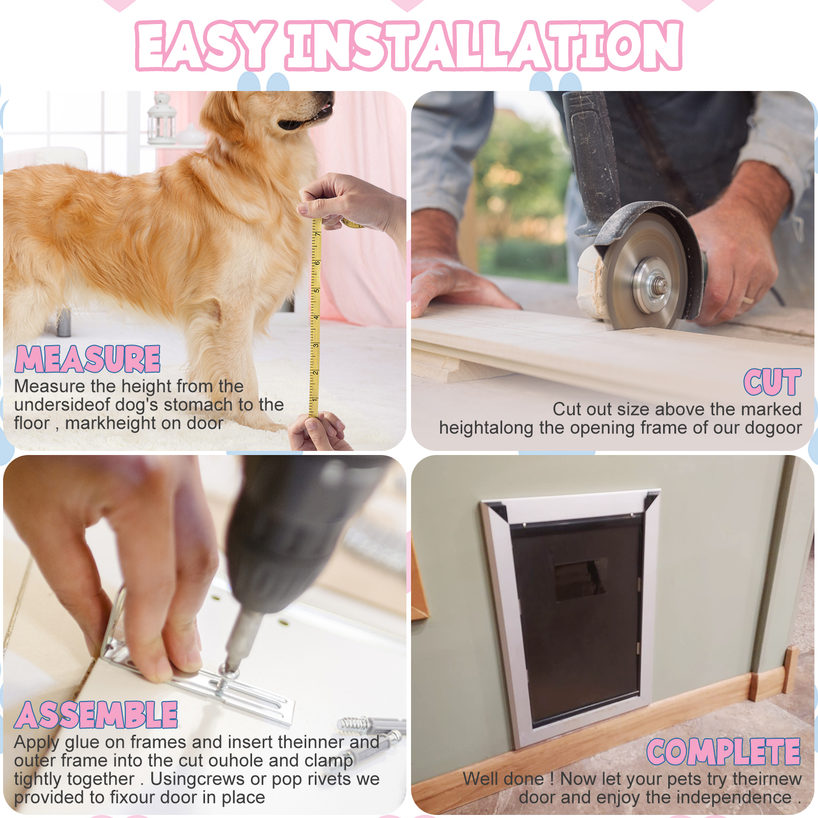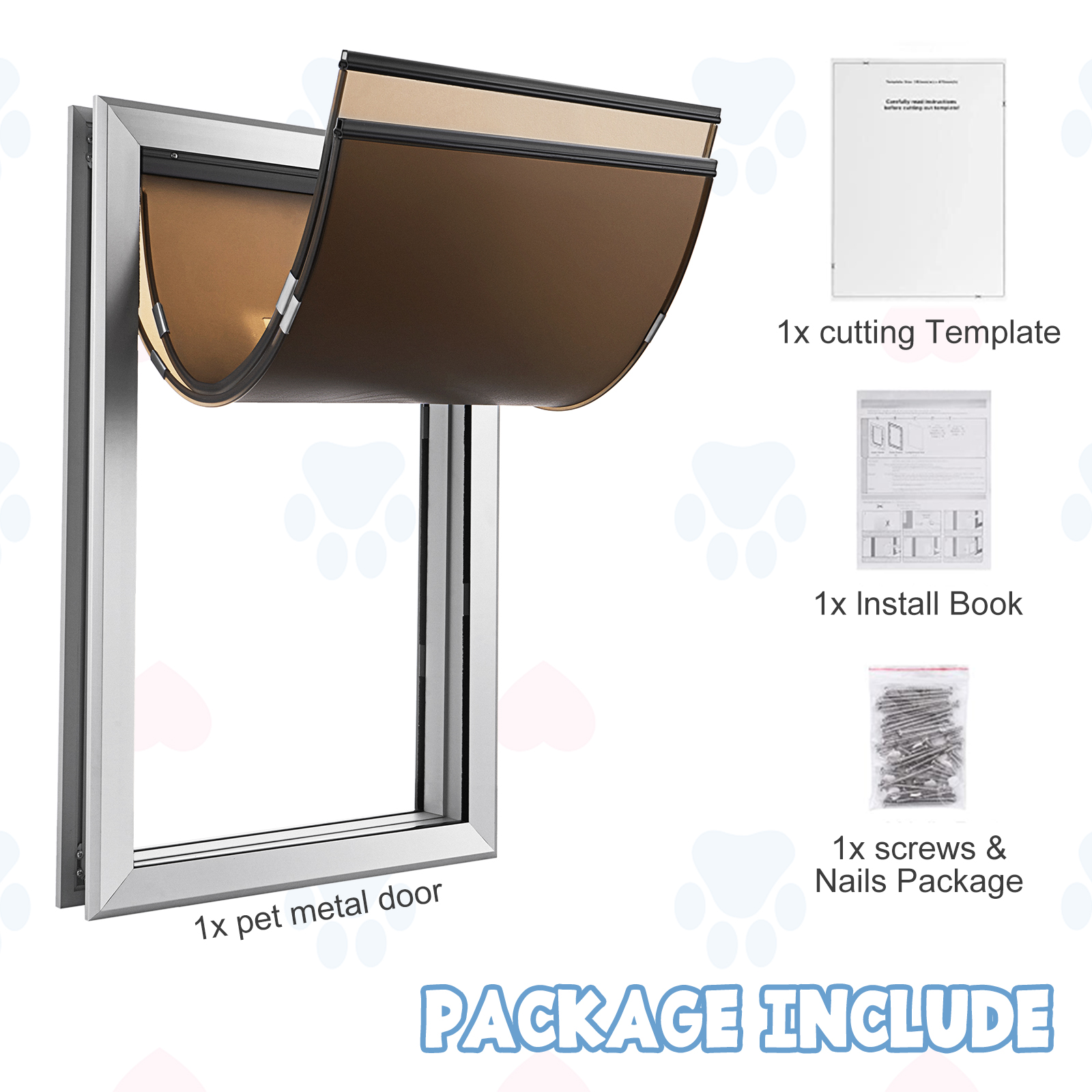 [Easy to install] This pet door is easy to be installed on all types of doors.It comes with a cutting template, a install instruction and mounting hardware to make installation installation simple and easy to complete. If you have questions about the installation or about the product, please do not hesitate to contact us.
