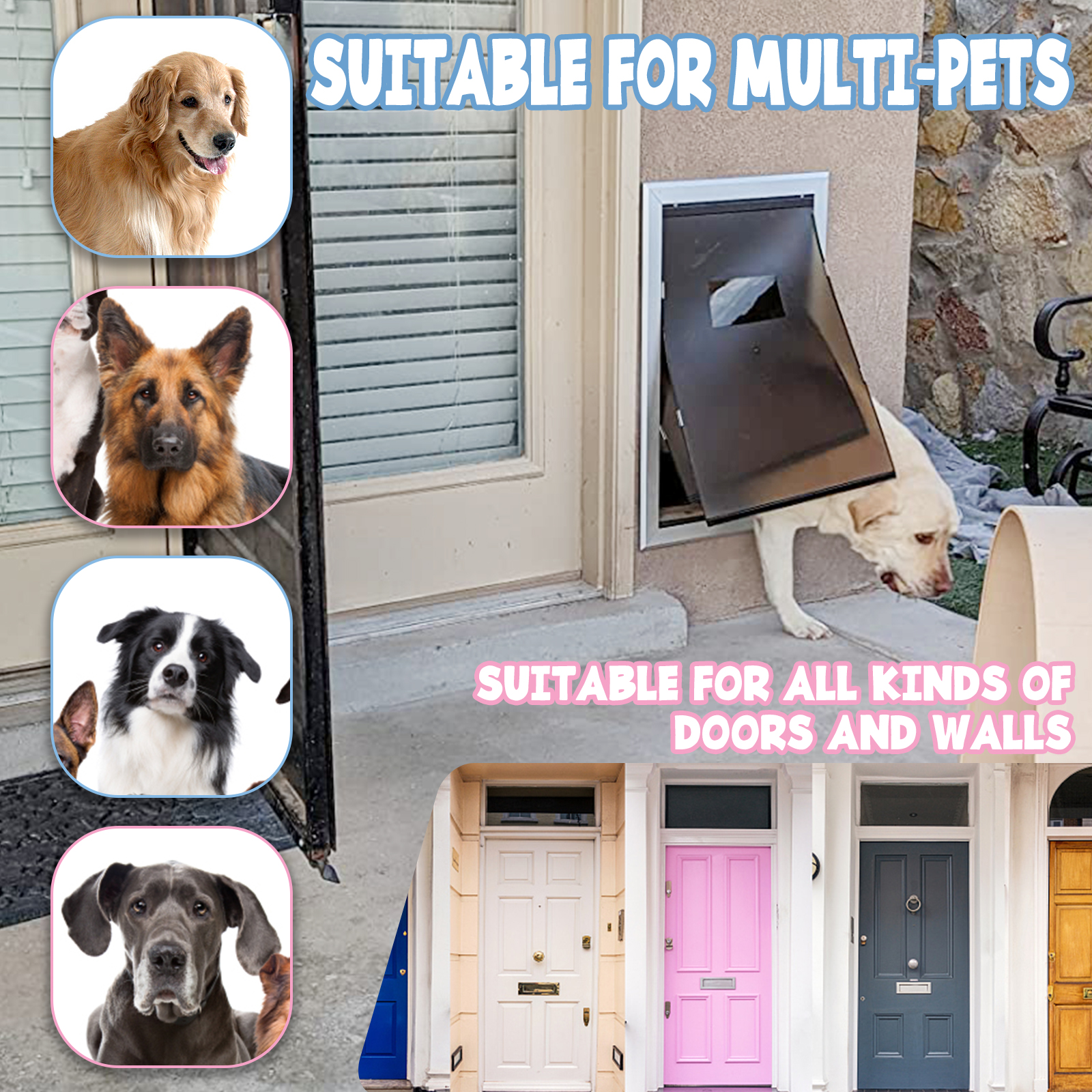 [Universal Door] This aluminium pet door is Universal for dogs and cats, free two-way pet entry and exit, large widened access for easy and convenient pet access. It’s suitable for all kinds of doors and walls.