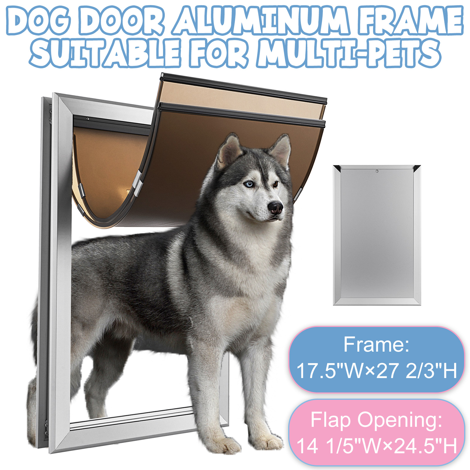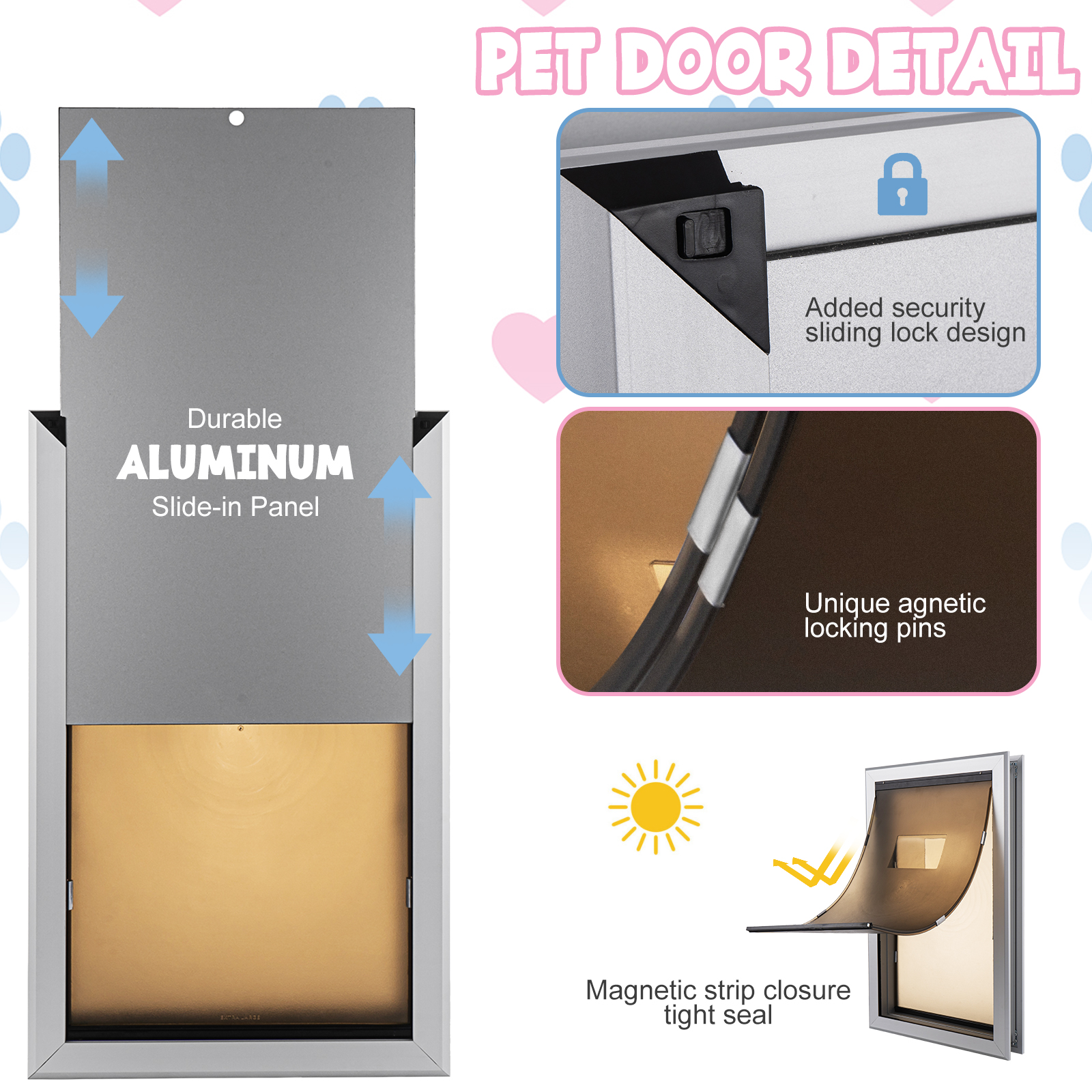 [Ingenious Details] The doggy door comes with a durable aluminum slide-in panel, security sliding lock design. These can keep you and your family safe at night or when you are not home by keeping other animals out of the house. Weatherproof magnetic closure and two UV-resistant flaps, suitable for different climates and provides energy efficiency.