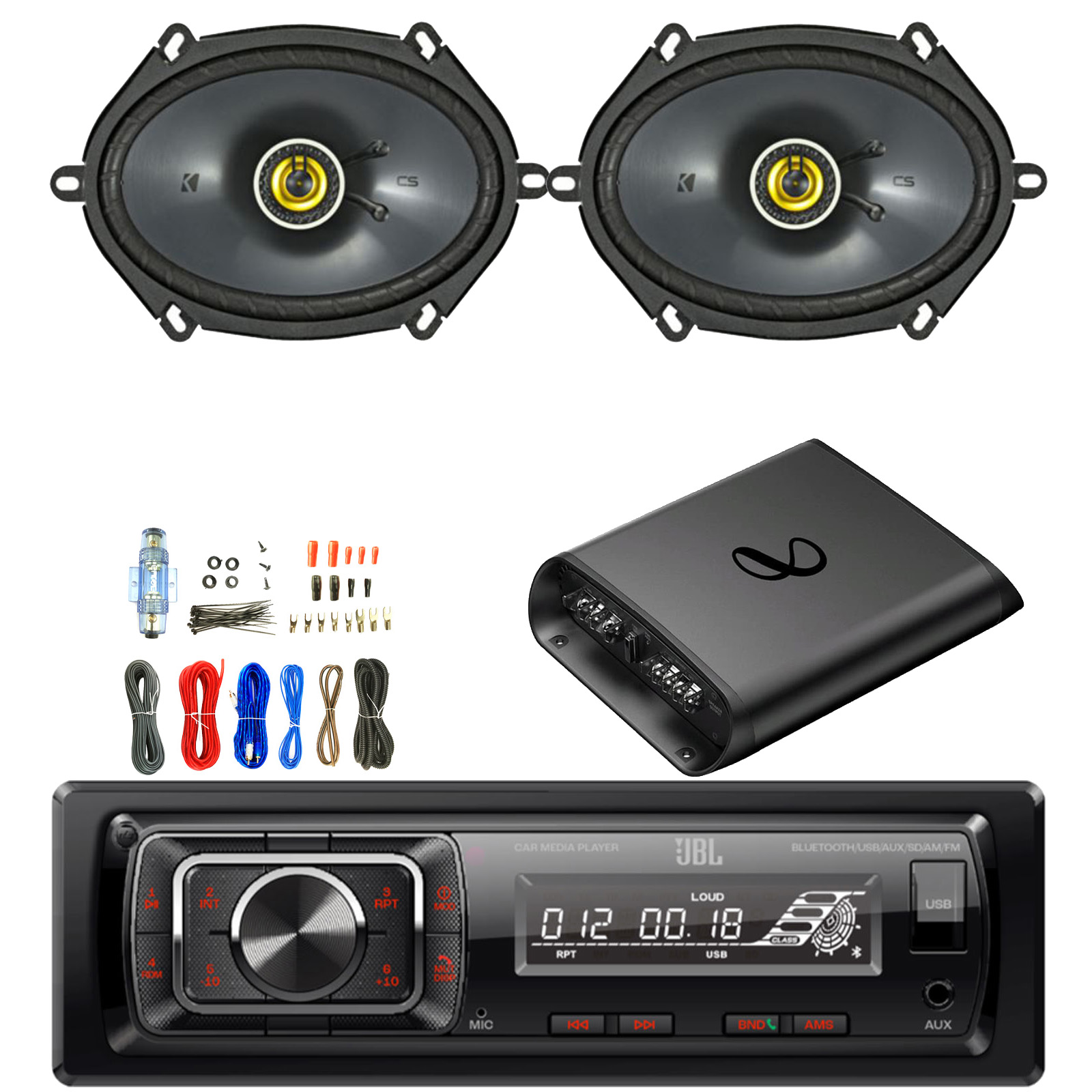 PACKAGE BUNDLE INCLUDES: JBL Celebrity150 Single-DIN Bluetooth FM Radio USB/AUX SD Card High Power Mechless with F/R and Sub output Car Media Receiver, 2x KICKER CS Series CSC68 6x8 " 225 Watts Peak Power 2-Way Coaxial Automotive Speakers, Infinity Alpha 1302A 2-Channel Class AB Amplifier W/8-Gauge Wiring Installation Kit