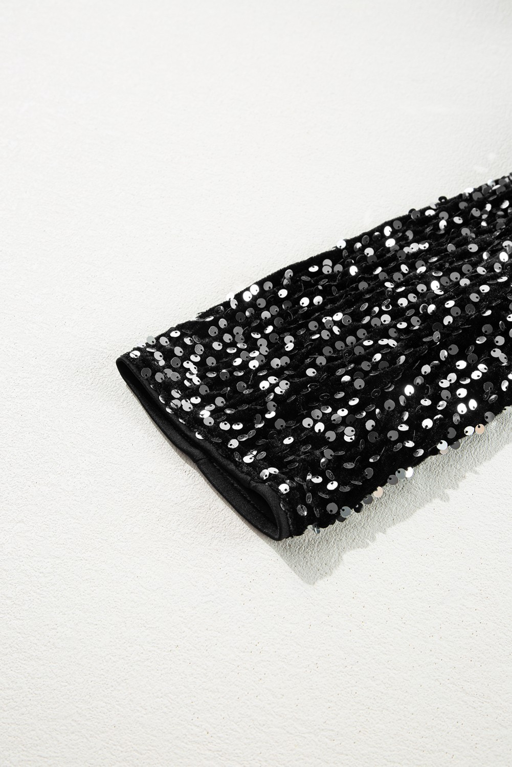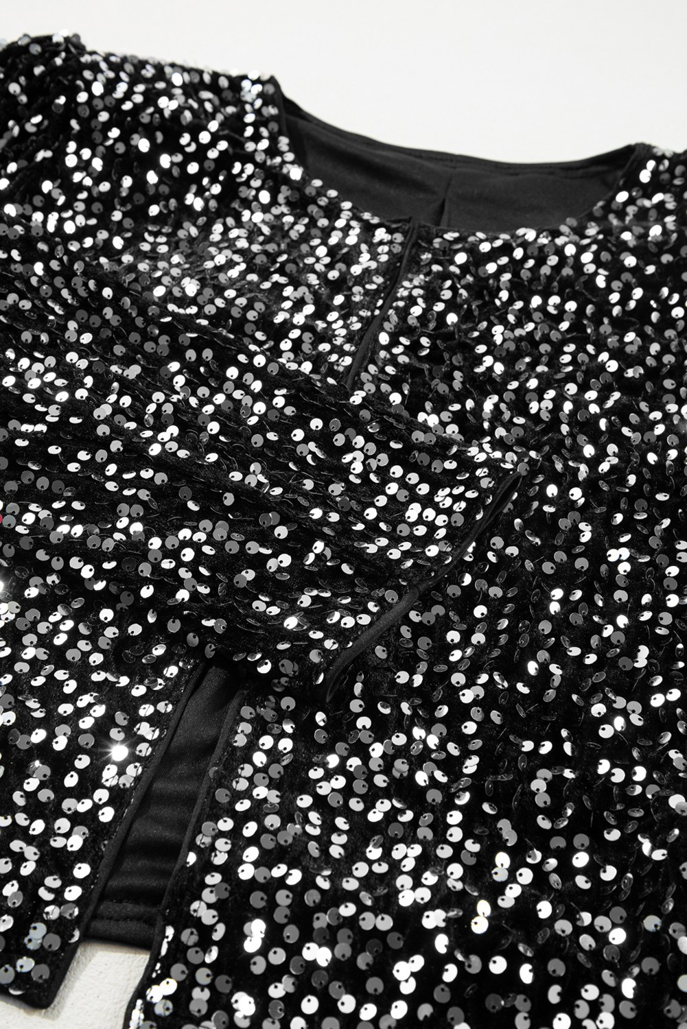 Shine brighter than the night with the Black Sequins Cropped Long Sleeves Jacket. Crafted with dazzling sequins, this statement piece effortlessly elevates any outfit. The open-front design and cropped silhouette add a modern edge, making it a must-have for your wardrobe. Made from durable PET material, this jacket is lightweight yet sturdy, ensuring all-night comfort and glamour.