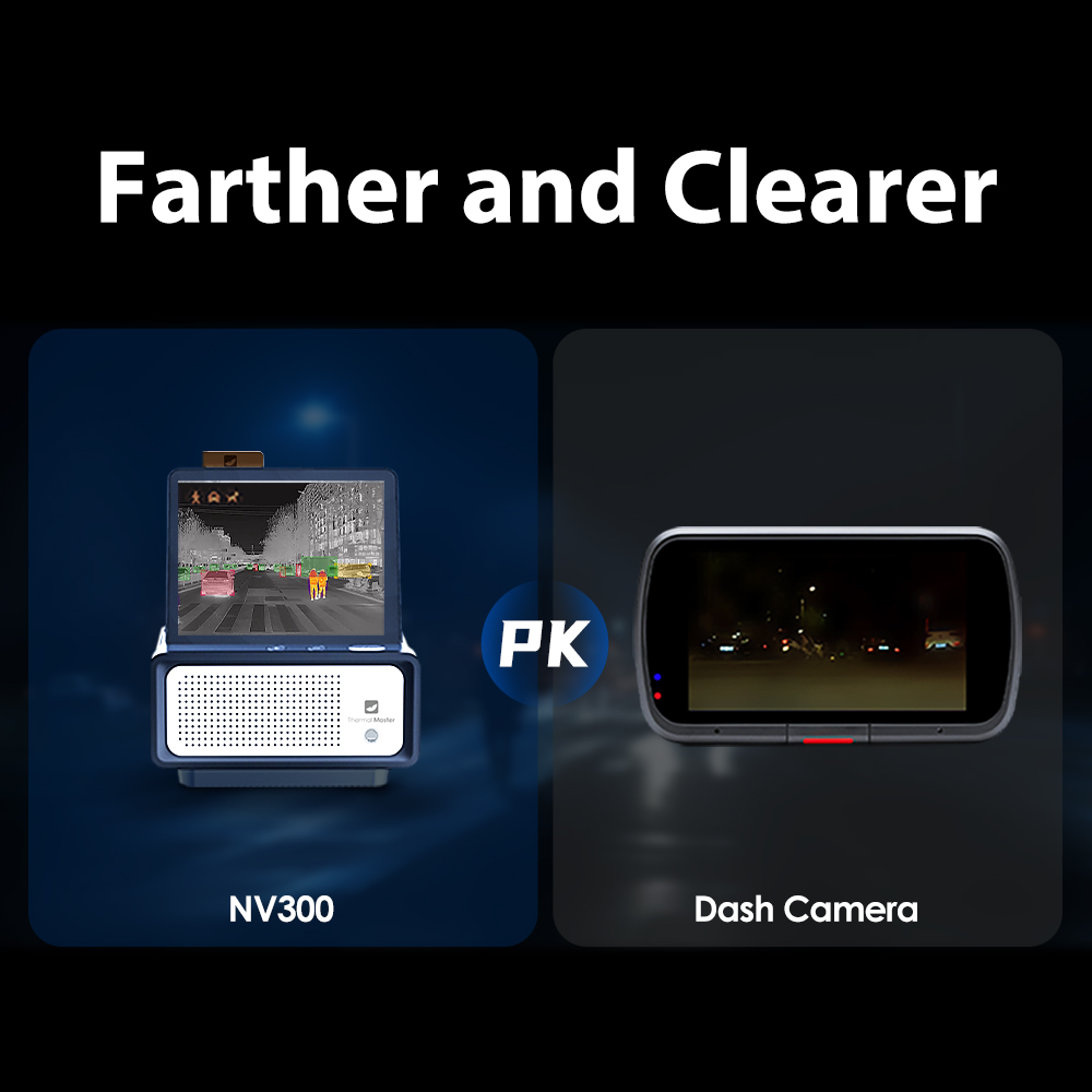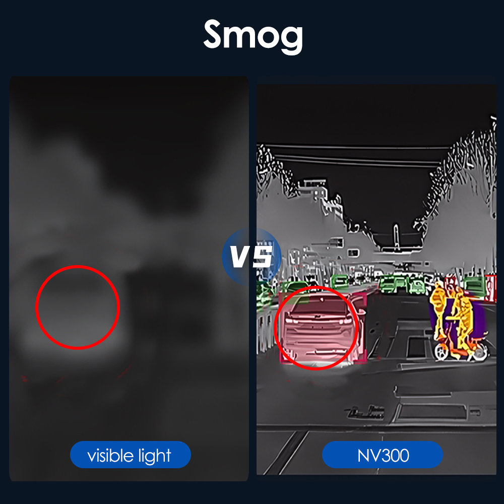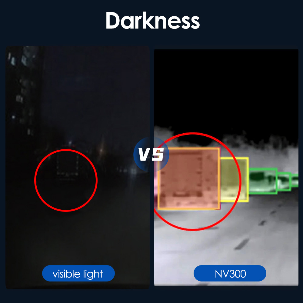 ● 【300m ultra far night vision】NV300 Car Thermal Imaging Camera provides 300 meters of ultra-long night vision, unaffected by high beam lights, turning night into day. In adverse conditions such as high beams, darkness, heavy fog, or rain, it is hard to see clearly, increases safety risks. The NV300 ensures drivers can accurately identify obstacles on the road during nighttime or above bad weather, highly enhancing driving safety and comfort.