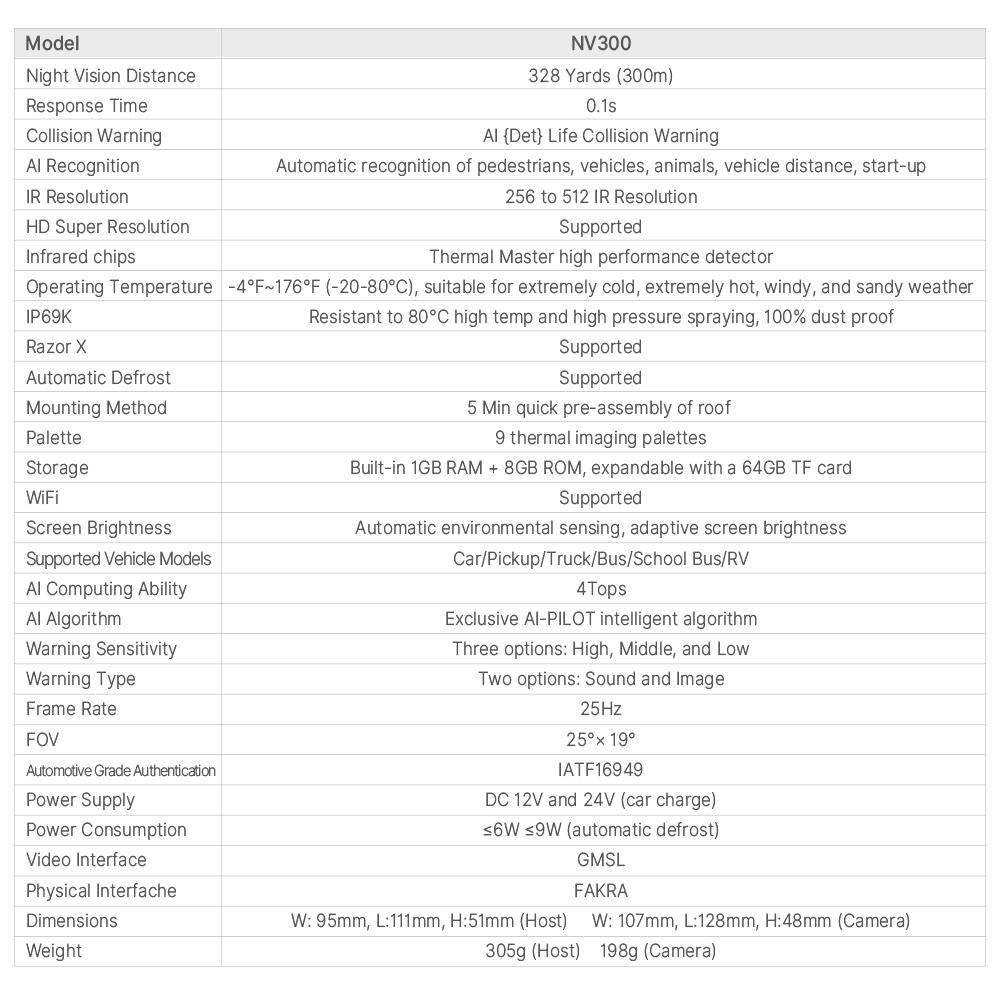 ● 【0.1s extremely fast response】NV300 is equipped with Thermal Master's High-Sensitivity Core and the 'Razor X' ultra clear image algorithm, enabling rapid response to potential dangers in just 0.1 seconds. Upon detecting pedestrians, vehicles, or animals, the system immediately issues audio and visual warnings, providing drivers with timely alerts to effectively reduce accident risks.