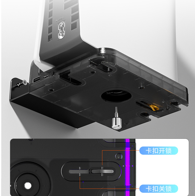 5. There is no need to install it on the wall. After assembling the PS5 host and plastic base, simply push it into the metal iron sheet installed on the wall to lock it. Removing the host only requires pushing to unlock, which is both worry free and effortless.
