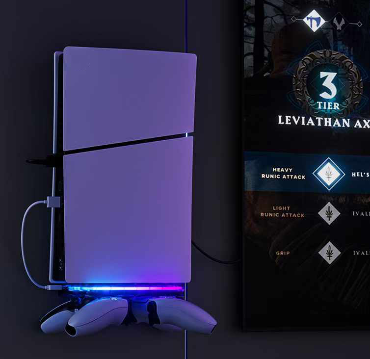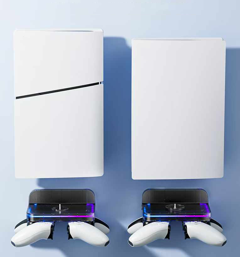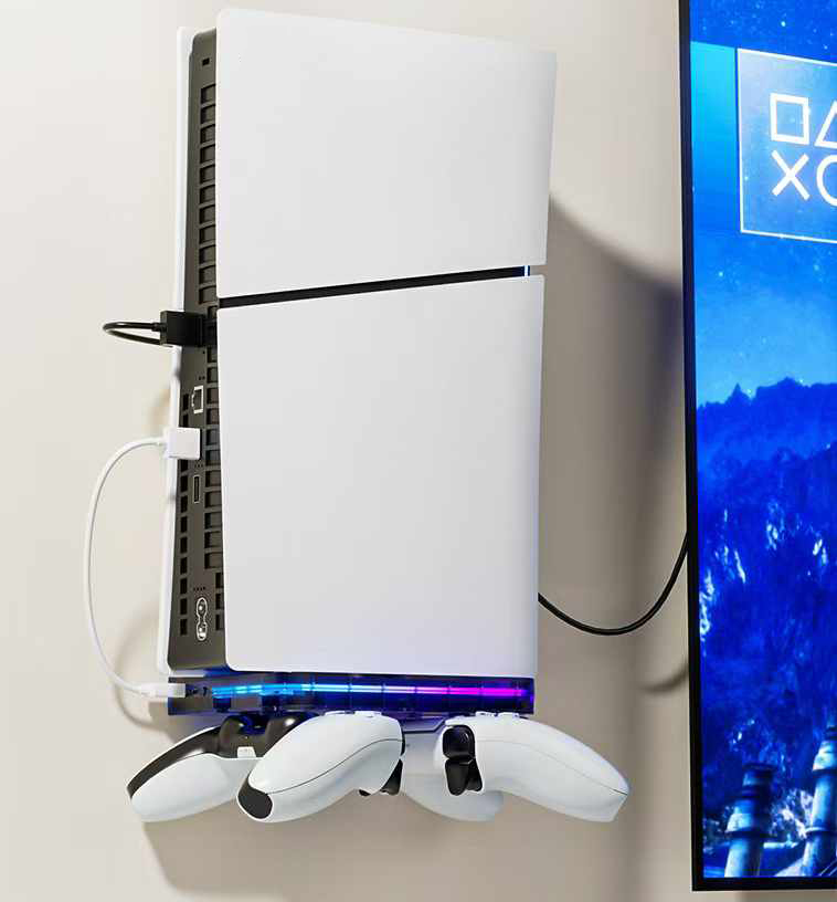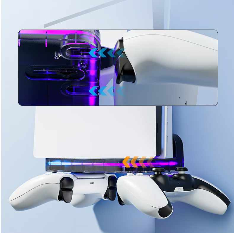 7. This hanger can not only be used to hang PS5 consoles, but the bottom of the bracket can also accommodate two PS5 handles, saving space with multiple uses.