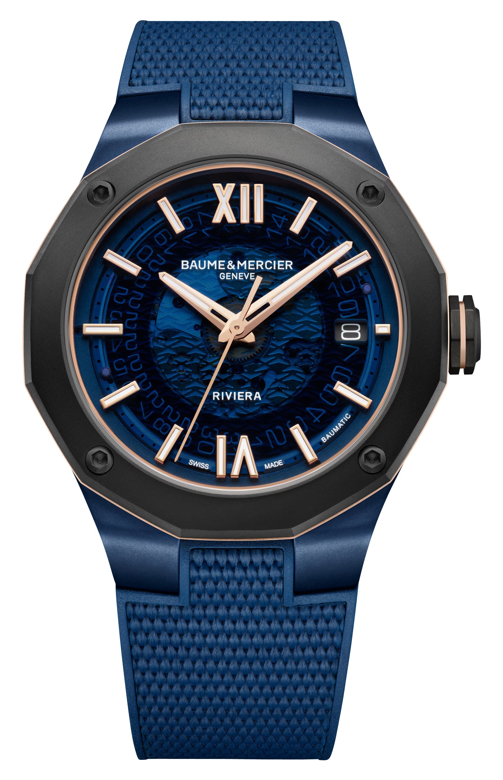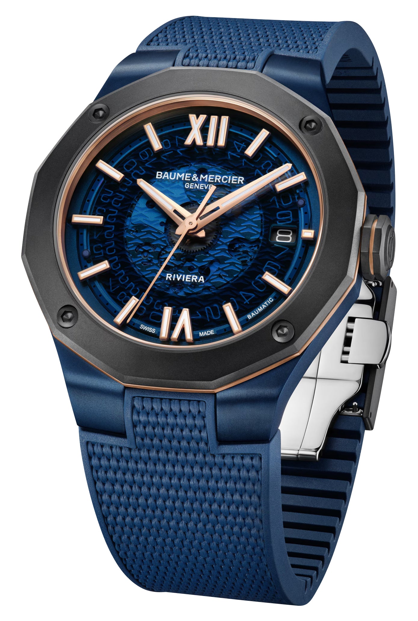 Created in 1973, the Riviera's return last 2021 aims to revive the spirit of a distinguished watchmaking era. This multifaceted Riviera imparts subtly nuanced hues, its dial reflecting the depth of the sea. It features a 42 mm dodecagonal blue PVD case and fixed gray PVD-coated titanium bezel fastened with 4 screws and an octagonal signed crown, both made of sandblasted ADLC-coated steel. Safely within is a transparent blue sapphire dial, giving a glimpse into the Riviera's internal mechanism. It has a rose gold-tone and luminescent skeleton hands, applied indices, and Roman numerals as hour markers at 6 and 12 o'clock. Complementing it further is a scratch-resistant sapphire crystal, a date aperture at the 3 o'clock position, central bezel/crown rings in matching rose gold-tone, and the brand's emblem that is etched on the crown. It is fitted with an integrated blue rubber strap and secured by a triple folding clasp with security push-pieces, also in sandblasted ADLC-coating. This watch has an exhibition caseback showcasing the in-house caliber Baumatic BM13-1975A, a Swiss automatic movement that beats 28,800 vibrations per hour generating an impressive 120 hours (5 days) of power reserve and is water-resistant up to 100 meters/330 feet.