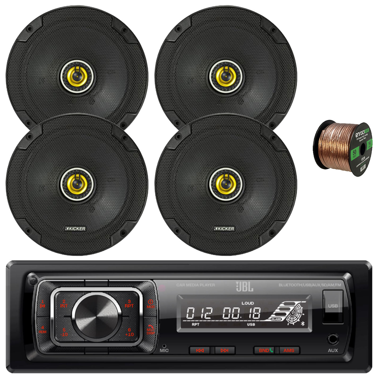 PACKAGE BUNDLE INCLUDED: JBL Celebrity150 Single-DIN Bluetooth FM Radio USB/AUX SD Card High Power Mechless with F/R and Sub output Car Media Receiver, 4x KICKER 46CSC674 CS Series 6.75" 300W Max Power Low Profile Coaxial Car Audio Speakers, 50 Feet 16 Gauge Speaker Wire