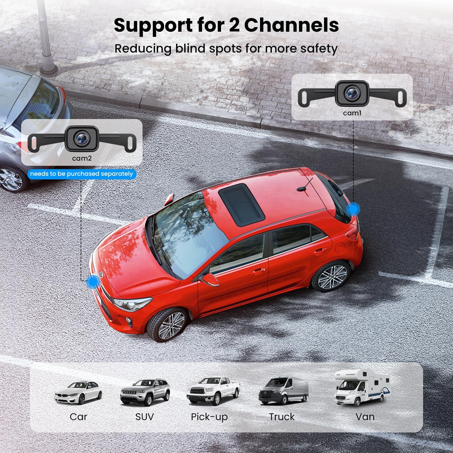 5" Car Monitor Supports 2 Cameras: you can add on a second wireless reverse rear view camera to as a side view or front view camera to reduce blind spot for your driving; Also you could used it as a monitoring camera to install inside your vehicle/horse trailer/RV. It is a good idea to buy a backup camera system as a gift for your father, boyfriend or son.