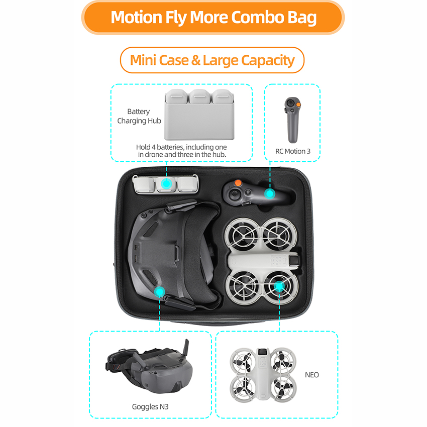l The kit bag can store NEO body, battery butler, 4 batteries, traversing rocker 3, flight glasses N3, and Sunnylife filters, spare propellers, screwdriver, charging cable and other accessories