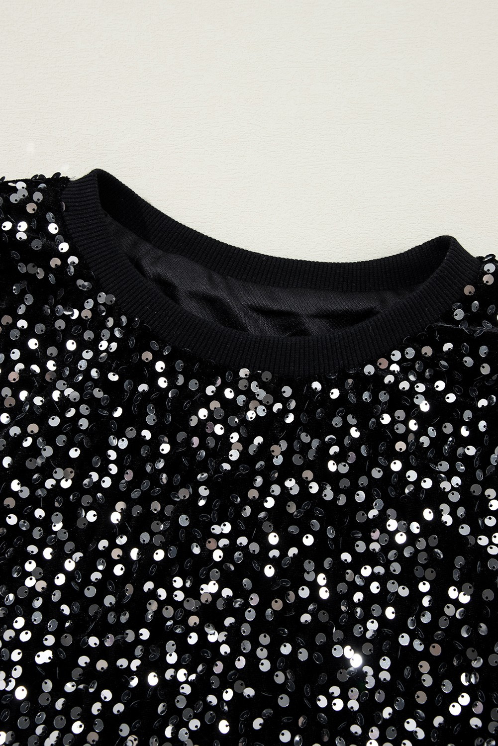 Make a statement with the Black Sequins Long Sleeves Blouse, crafted from shimmering PET material for a bold and glamorous look. This cropped blouse is adorned with sparkling black sequins that catch the light beautifully, making it a standout piece for any occasion. The crew neckline and long sleeves provide a balanced silhouette, while the cropped length adds a trendy and youthful touch.