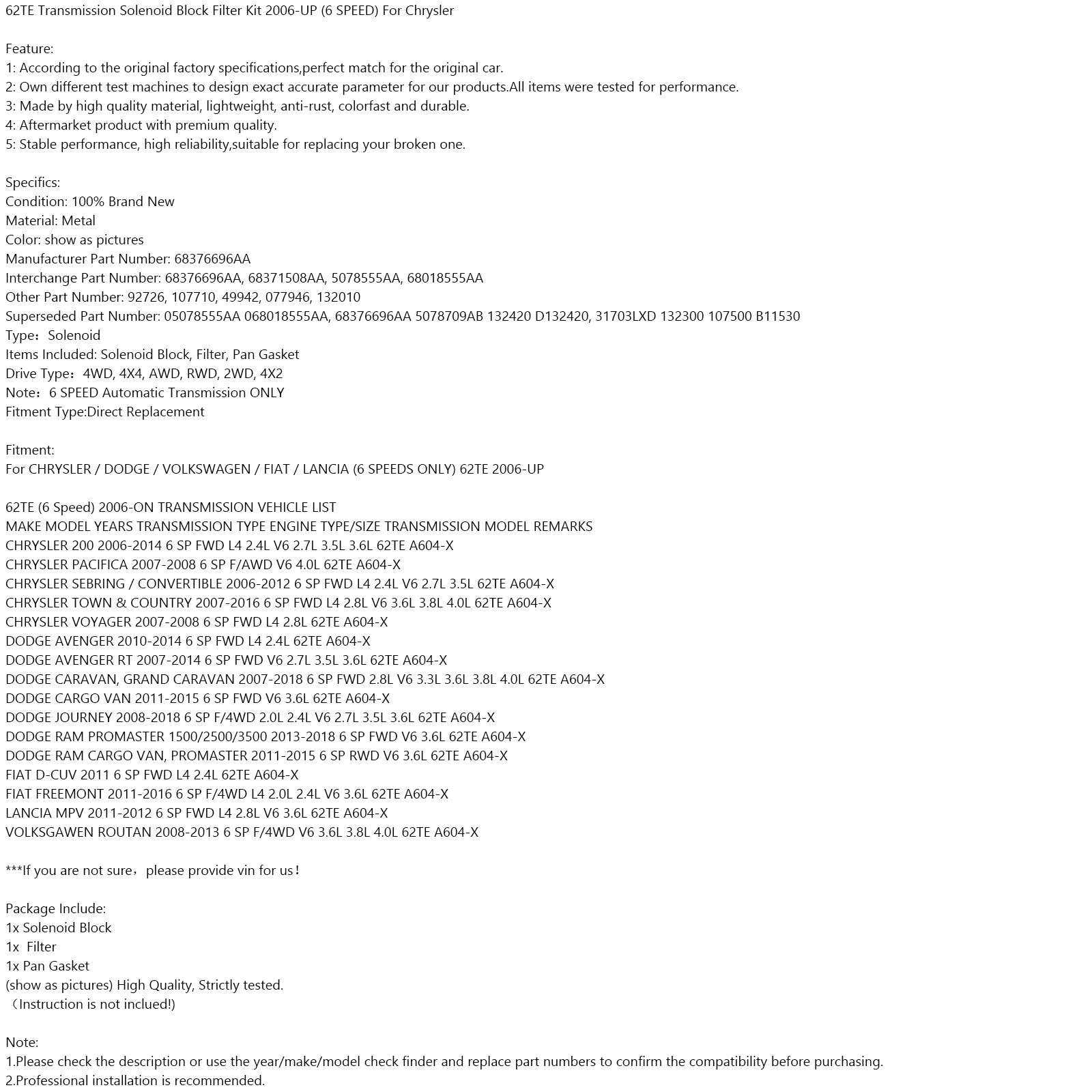 Items Included: Solenoid Block, Filter, Pan Gasket