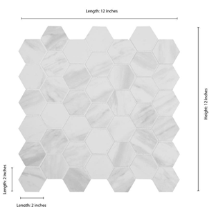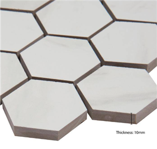 - 12 in. width x 12 in. length x 10 mm thick mesh-mounted mosaic. 2 in. hexagon pieces.