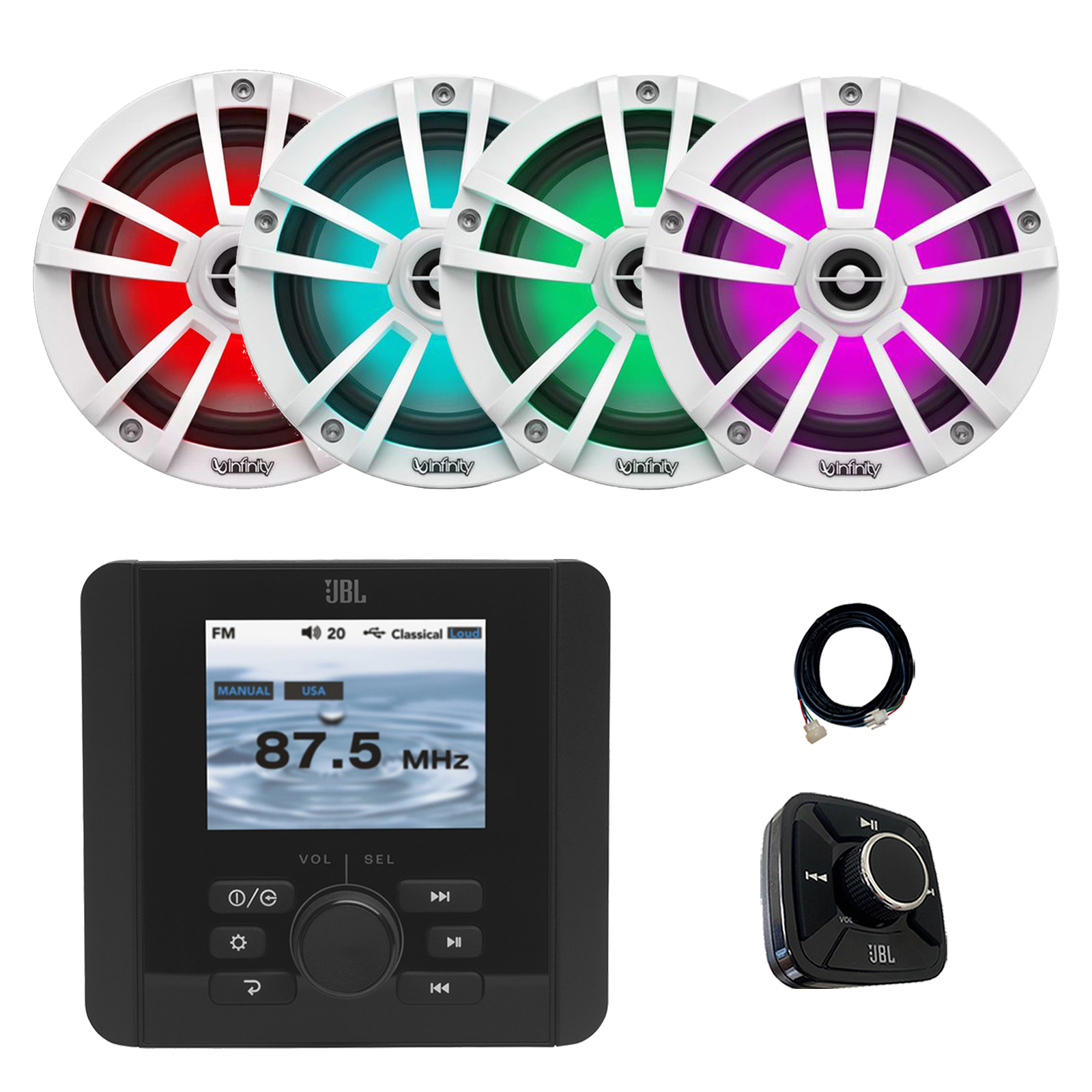 PACKAGE BUNDLE INCLUDES: JBL JAM5000N Marine USB Bluetooth AM/FM/WeatherBand Radio Receiver with Wired Remote, Extension Cable, 4x 6.5" 225 Watt Max Power 2-Way Multicolor LED Boat Audio Speakers (White, Bulk Packaging)