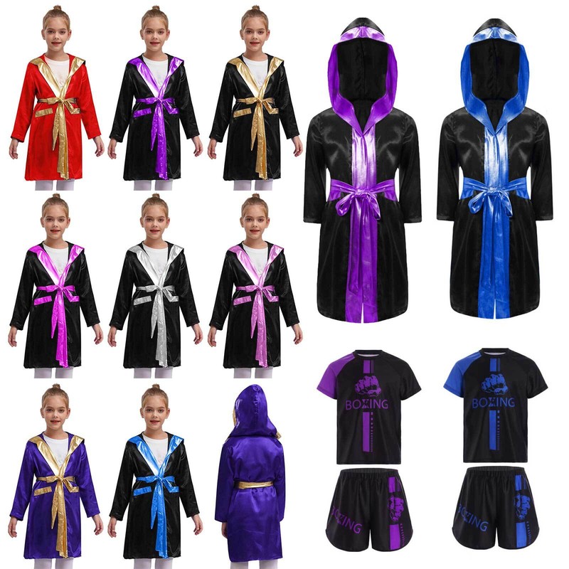 Satin hooded robe with two fake pockets and gold metallic trim to make your child look like a champion boxer. Come with a belt.
