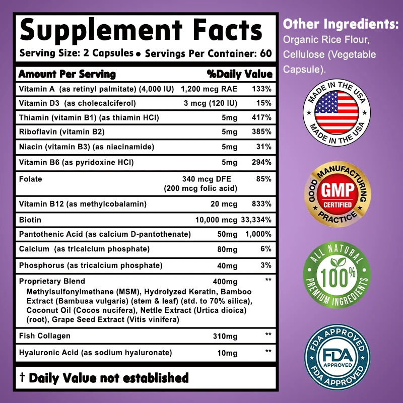 Ingredients: Biotin, Collagen, Keratin, MSM