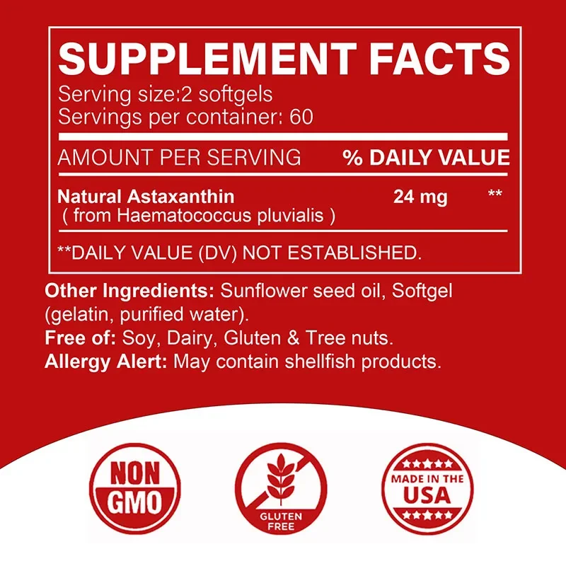 HIGH QUALITY: Our Astaxanthin capsules are free of soy, dairy, gluten, preservatives, flavorings, and nuts.