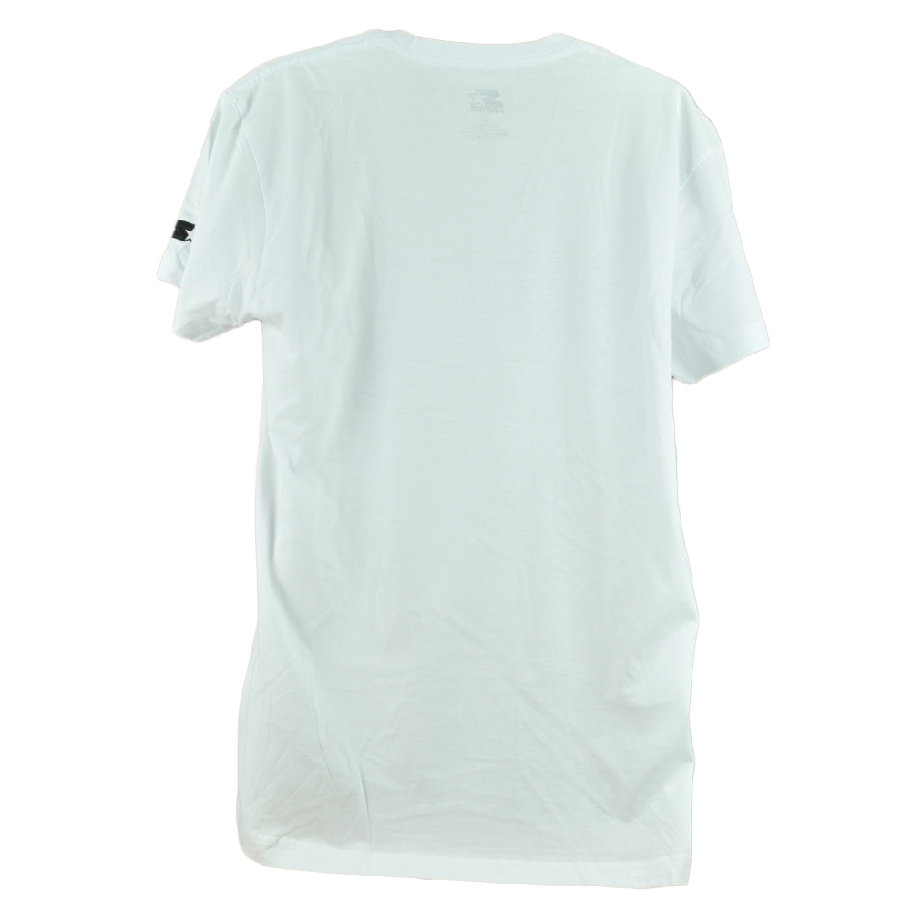 Description: Show the love for your team wearing this shirt. This Starter shirt features Team designs printed on front. Brand logo embroidered on the right sleeve. Adults men size. Color white. This shirt is made of 60% Cotton 40% Polyester. Crew neck, short sleeve for a comfortable fit. Made in Pakistan. Authentic Merchandise. Officially Licensed Product. Brand new item with tags.