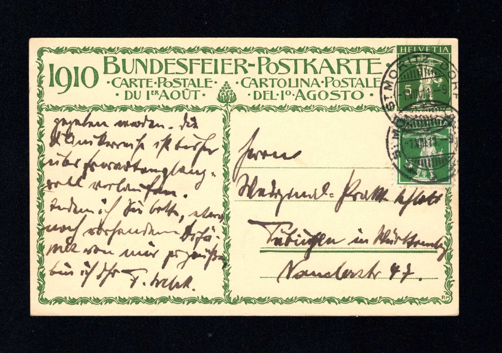 Ganzsache 5 + 5 Rp. Zusatz. St. Moritz Dorf nach Tübingen