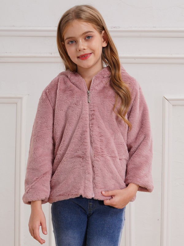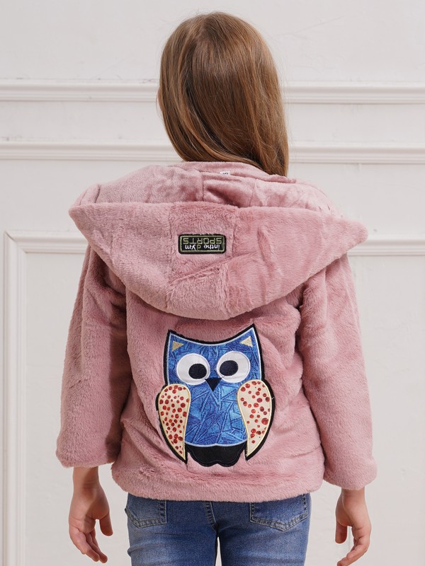Girls Faux Fur Warm Coat Hooded Long Sleeve Front Zipper Cartoon Owl Print at Rear Coat.
