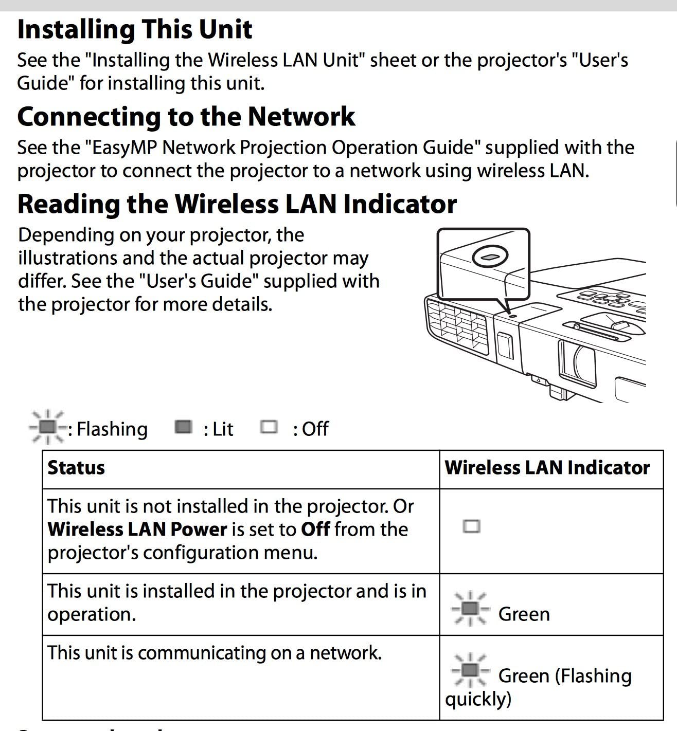 Product Description This high-speed, wireless network adapter plugs directly into select Epson projectors allowing quick and easy access to the LAN or peer-to-peer networks without wires or cables. When used with Epson EasyMP Monitor and Network Projection software, users can remotely access and control projectors over the wireless LAN. Compliant with 802.11 b/g/n standards Uses USB type A connector Compatible with PC or Mac Able to transmit audio |