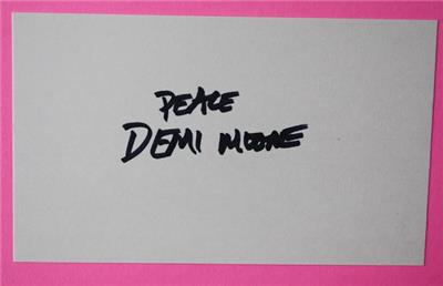 Check it out...Here's an 8 1/2" wide by 11" tall AUTOGRAPH & photo of "St. Elmo's Fire" Hollywood Movie star & "Brat Pack" star Demi Moore-The 3" tall by 5" wide card has a large black ink signature signed "Peace Demi Moore" in her own hand and has been tipped to a larger bright pink backer with a photo of Ms. Moore on front.