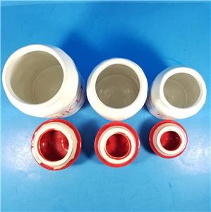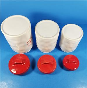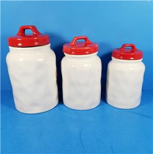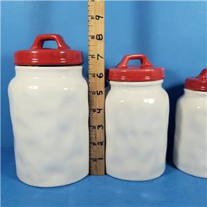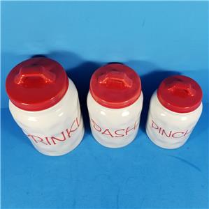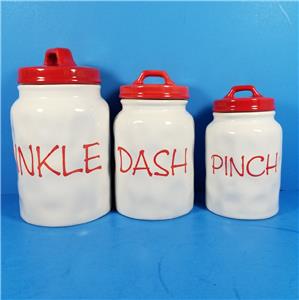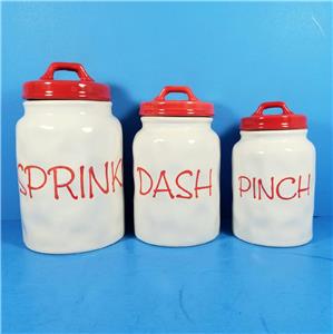Super cute Canister Set with "Sprinkle, Dash, & Pinch" in red letters on white ceramic with matching red lids.