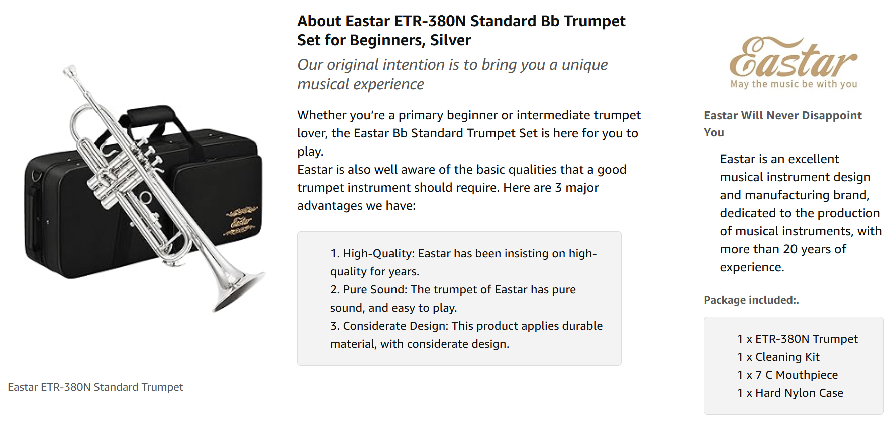 COMES WITH EVERYTHING NEEDED— The package includes Eastar B flat Trumpet, White Gloves, Cleaning Suit, 7C Mouthpiece, Hard Case, 12-Month Product Warranty backed by our awesome customer support team ready to help.
