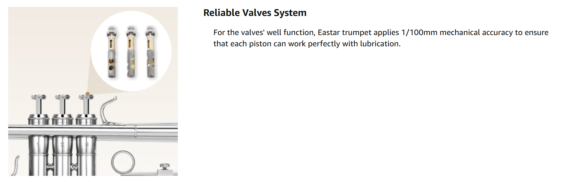 RELIABLE DESIGN— Equipped with a unique valve system (1/100mm mechanical accuracy) designed by Eastar, the trumpet is highly durable during performance without worrying about getting stuck.