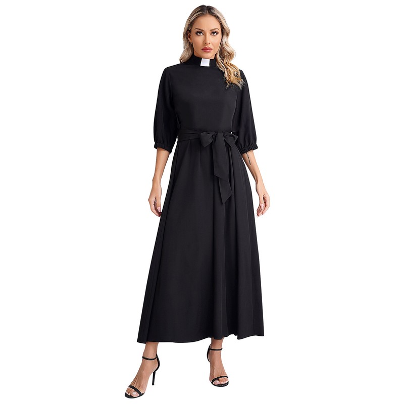 Church clergy gown for women, mock neck, maxi length, 3/4 sleeve with elastic cuffs for a better fit. Pair with a belt.