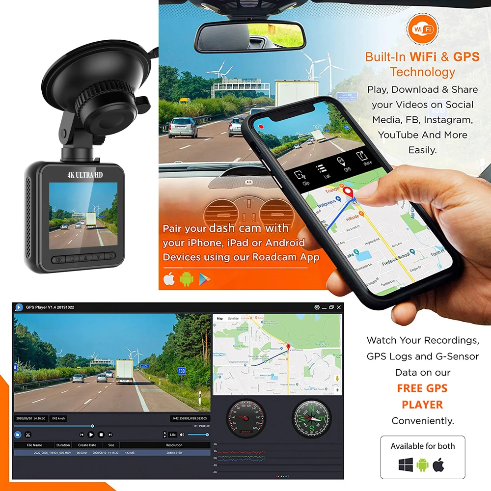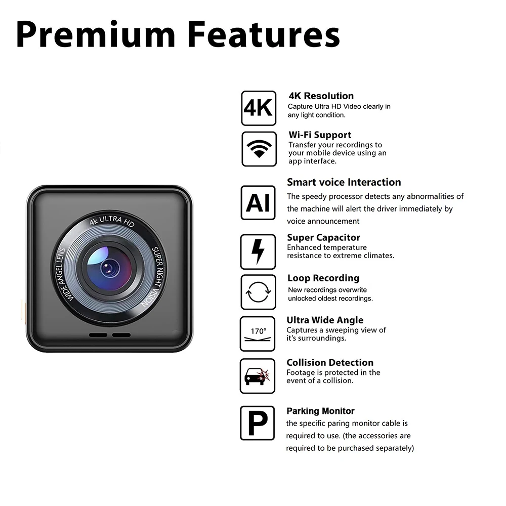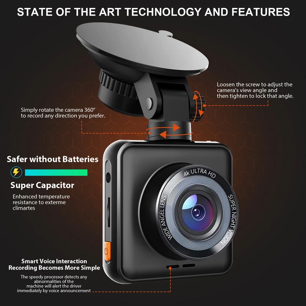2. 4K UHD SUPER HI-VISION: UItra HD 3840* 2160P, Sony IMX335 image sensor, WIFI Connect, Loop recording and G-sensor, Supercapacior, Smart Voice Interaction, Smart Voice Interaction.