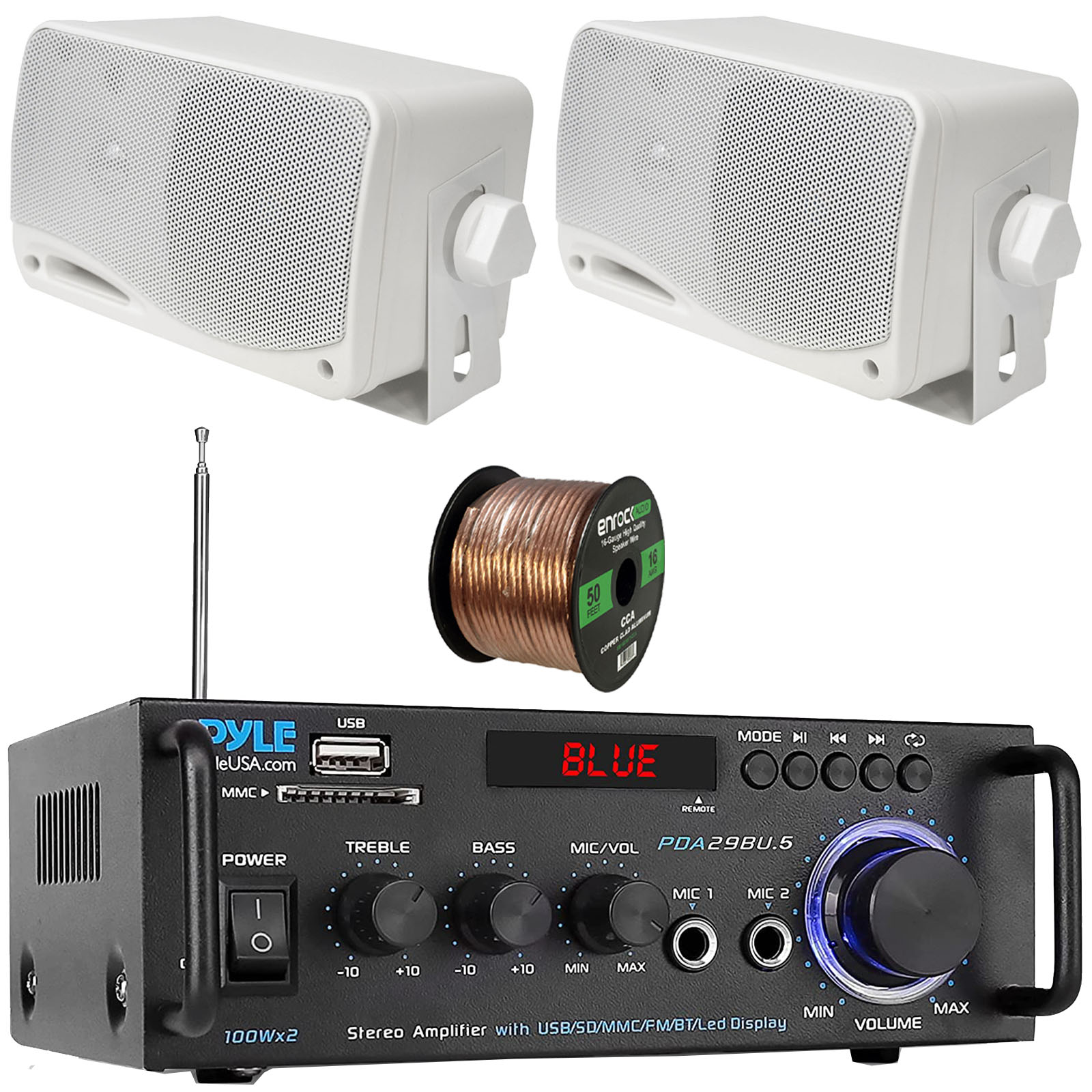 PACKAGE BUNDLE INCLUDES: Pyle PDA29BU.6 Bluetooth USB/SD/FM Compact Power Stereo Home Audio Amplifier Receiver - Blue Series with Wireless BT, RCA & Speaker Terminals, 2x Pyle PLMR24 3.5'' 200W Max Power 3-Way Weather Proof Mini Box White Speakers, 50 Feet 16 Gauge Speaker Wire