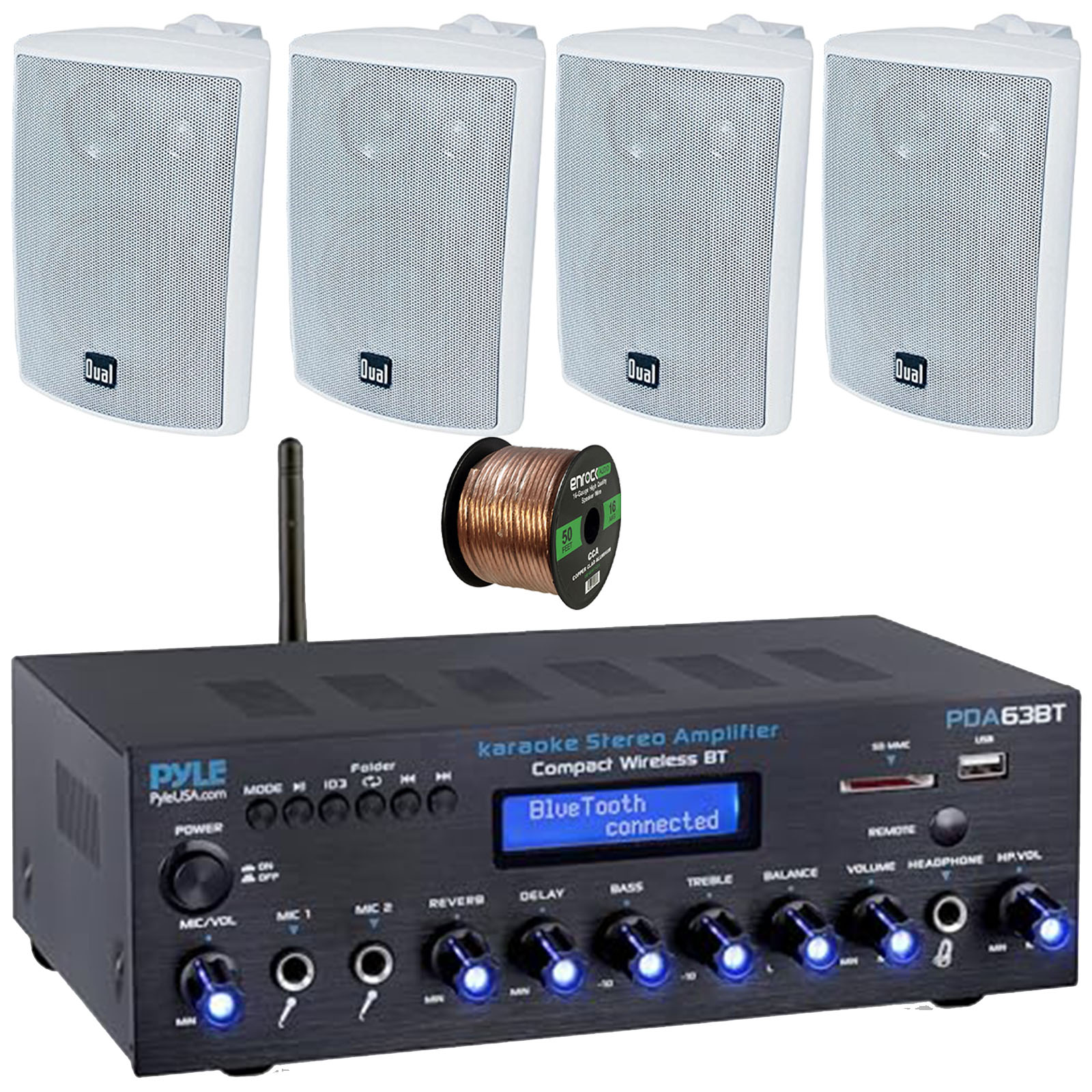 PACKAGE BUNDLE INCLUDES: Pyle PDA63BT Wireless Bluetooth USB/SD/AUX FM Radio Home Audio Amplifier Receiver, 4x Dual Electronics LU47PW 4" 200W Max Power 3-Way Indoor/Outdoor White Speakers, 50 Feet 16 Gauge Speaker Wire