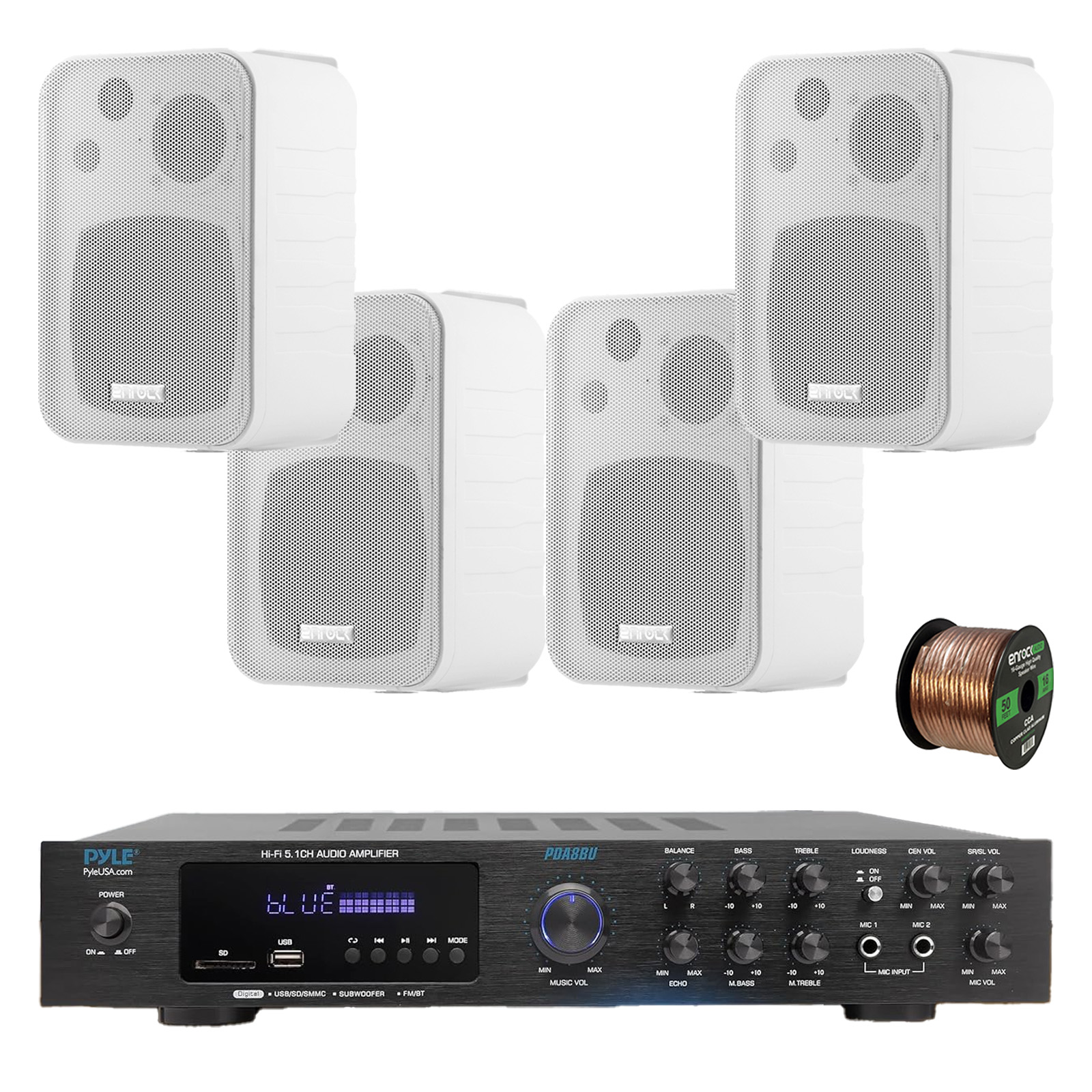 Pyle PDA8BU 5.1 Channel Home Audio Theater Bluetooth MP3/USB/SD/AUX/FM Radio Receiver, 4x 4" 30 Watt Peak 3-Way Water-Resistant Indoor/Outdoor Audio Speakers (White), 50 ft 16 Gauge Speaker Wire