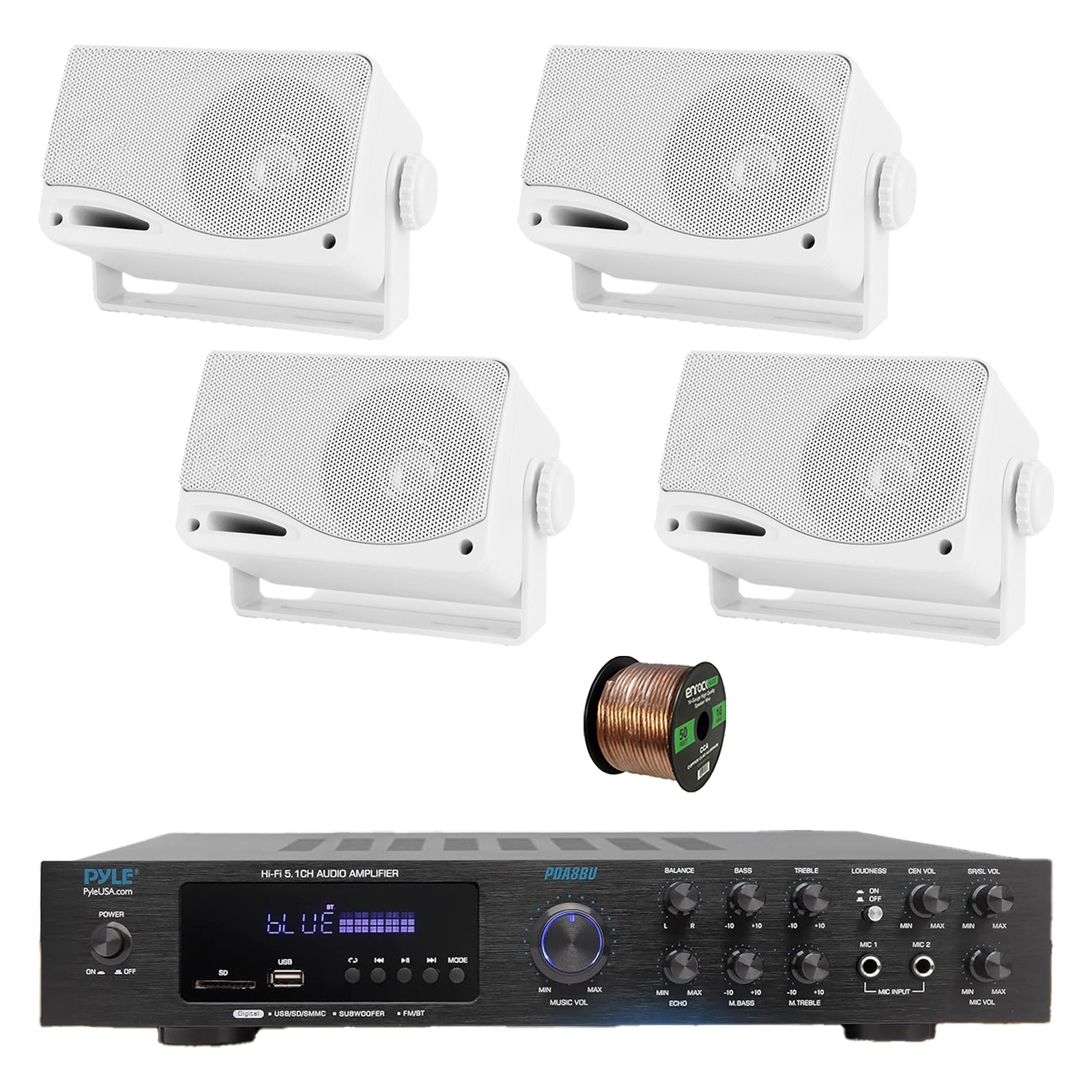 Pyle PDA8BU 5.1 Channel Home Audio Theater Bluetooth MP3/USB/SD/AUX/FM Radio Receiver, 4x 3.5" 200 Watt Peak 3-Way Indoor/Outdoor Wall Mount Audio Speakers (White), 50 ft 16 Gauge Speaker Wire