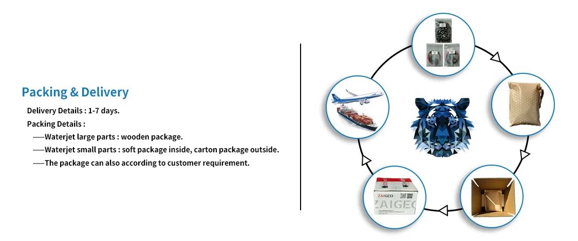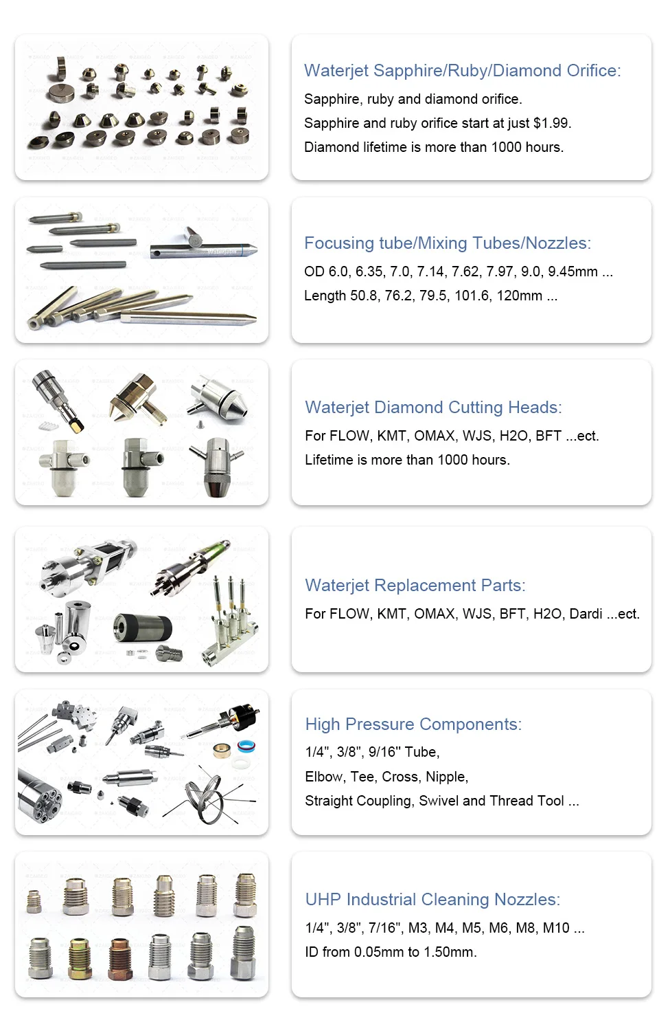Zaigeo waterjet has been specializing in 480-680 MPa (60K-90K) waterjet cutting parts and UHP (Ultra High Pressure) industrial cleaning nozzles for 10 years. Our primary product range includes waterjet nozzle, mixing/focusing tubes, waterjet sapphire, ruby, diamond orifice, diamond cutting heads and waterjet replacement parts for various brands such as FLOW, OMAX, KMT, WJS, Jet Edge H2O, Dardi, BFT, Accustream etc.