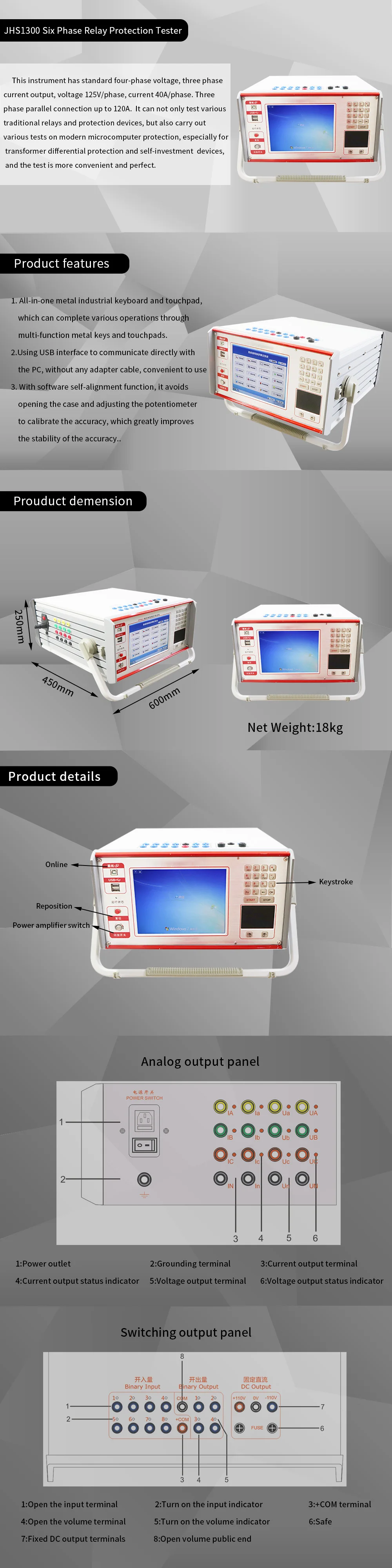 1.Meets all the requirement of field tests. This tester with standard 6 phase voltage, 6 phase current output, voltage 125V/phase, current 30A/phase, 6 phases in parallel can up to 180A. Digital Signal Processor Microcomputer. Not only test the traditional relays and protectors, but also test the modern microcomputer relays, special for transformer differential protection and transfer equipment.