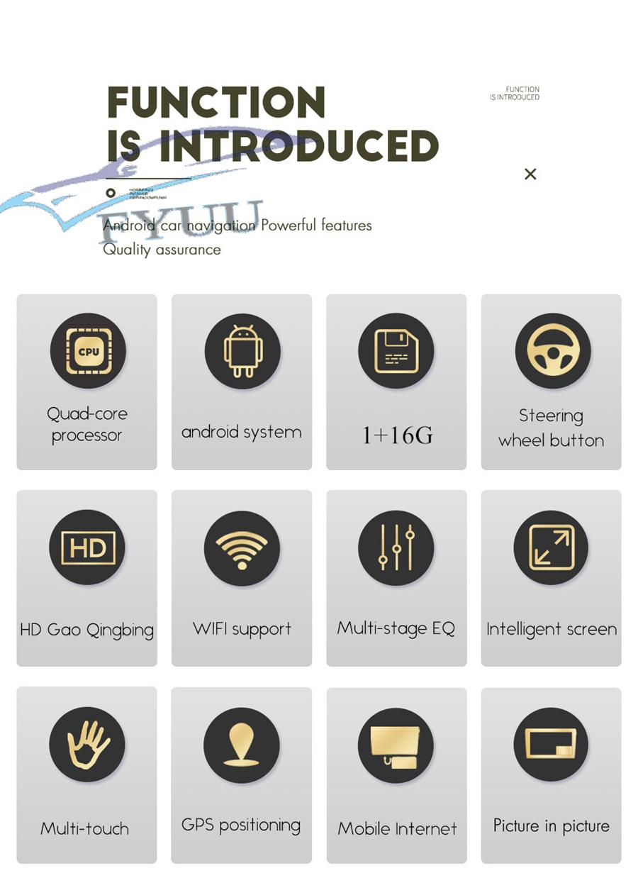 - WiFi/Hotspot/Bluetooth: Yes - Brightness level adjustable: Yes - Wallpaper: Wallpapers/Live Wallpapers/Gallery - Sound: Key Tone & Volume - Storage: Display Internal Storage/Nand Flash/Connected Device Storage - Apps: Running Apps display/force stop/uninstall - Security: Yes - Accounts: Yes - Languages and Input: more than 70 Languages and choose input method - Backup and Reset: Yes - Date and Time: Setting Date&Time by yourself or choose GPS/network-provided time - Accessibility: Yes - GPS: Yes, GPS application options/monitoring/sound mode/mixing ratio - Driving safety: Watching Video, Reversing X-mirror/Volume, Reversing Trajectory/radar Display, Rear view ruler - Amplifier: Rock/Pop/Jazz/Classic/Flat/Voice/Custom - Steering Wheel Control: Yes - About Device: Display Parameter Info. |