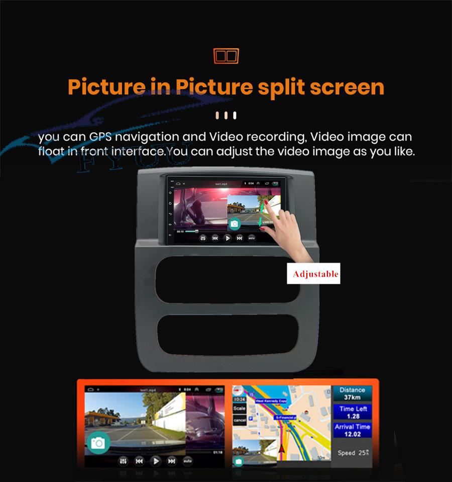 - Touch Screen: Yes - Resolution: 1024*600 - Capacitive or Resistance Screen: Capacitive - Built-in Clock and Calendar: Yes, show real time and can use network-provided time - Main Menu Status Bar display: Can be changed to Music/Radio/BT-Stereo Player and Clock/Date/Week - Change Apps-Icon Position: Yes - Picture in picture split screen:Yes |