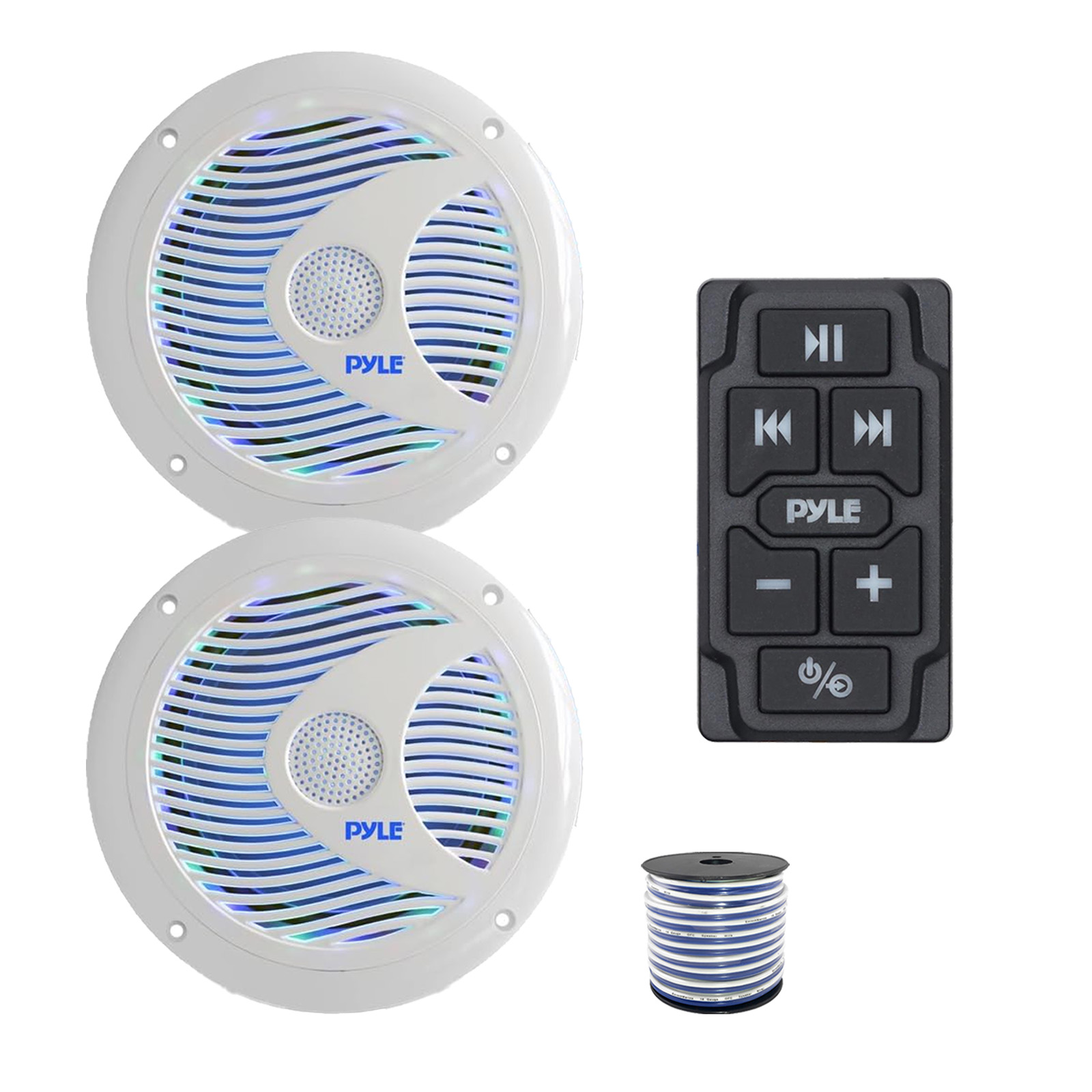 • PACKAGE BUNDLE INCLUDES: Pyle PLMRBTRK1 Marine Wireless Bluetooth Audio Controller, 2x 6.5'' 150 Watt Max Dual Cone Marine Multicolor LED Outdoor Audio Speakers (White) w/Wire