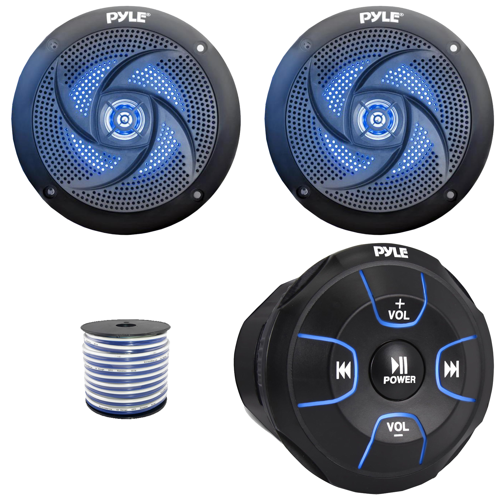 Pyle PLMRBT18 Bluetooth Audio Amplified Marine Waterproof Controller, Pyle PLMRS43BL 4" 100 Watts Max Power 2-Way Low Profile Blue Flashing LED Boat Audio Speakers (1 Pair), 50 Feet 18G Speaker Wire