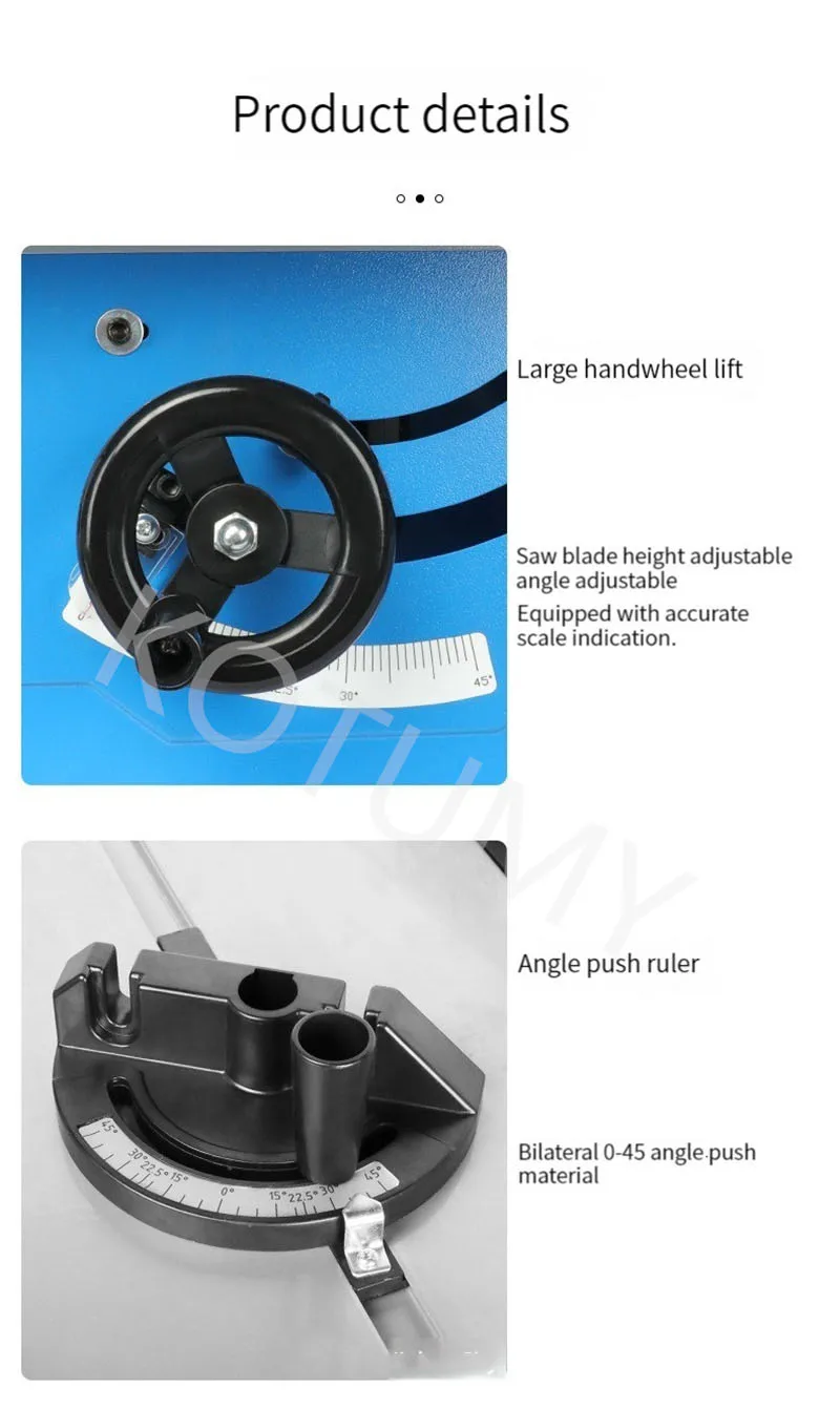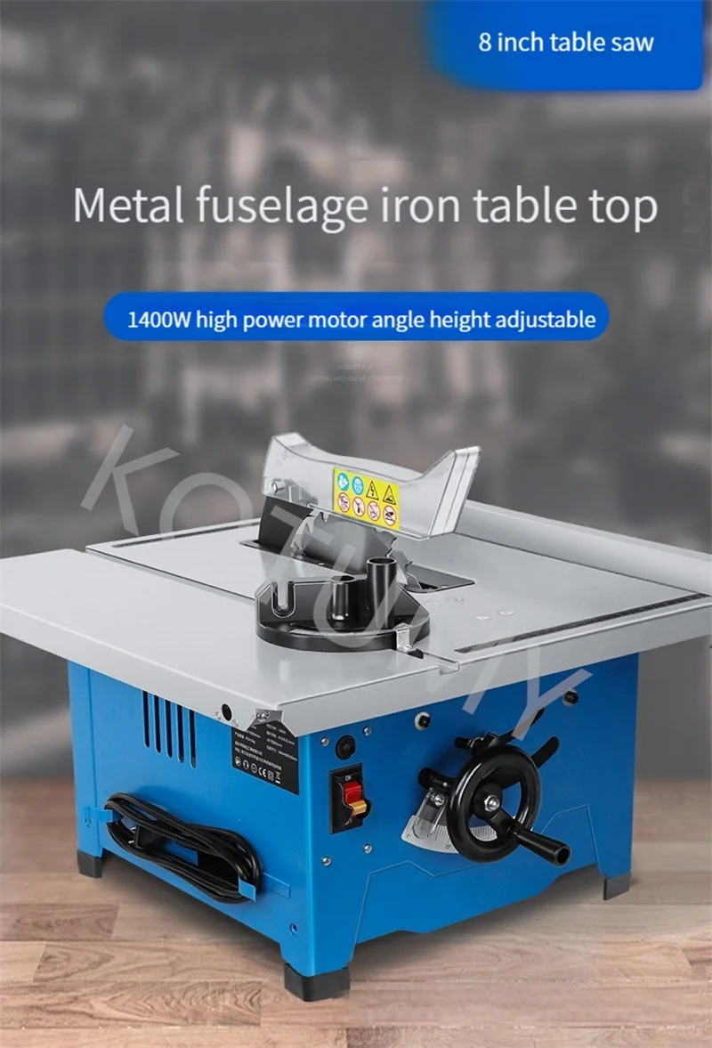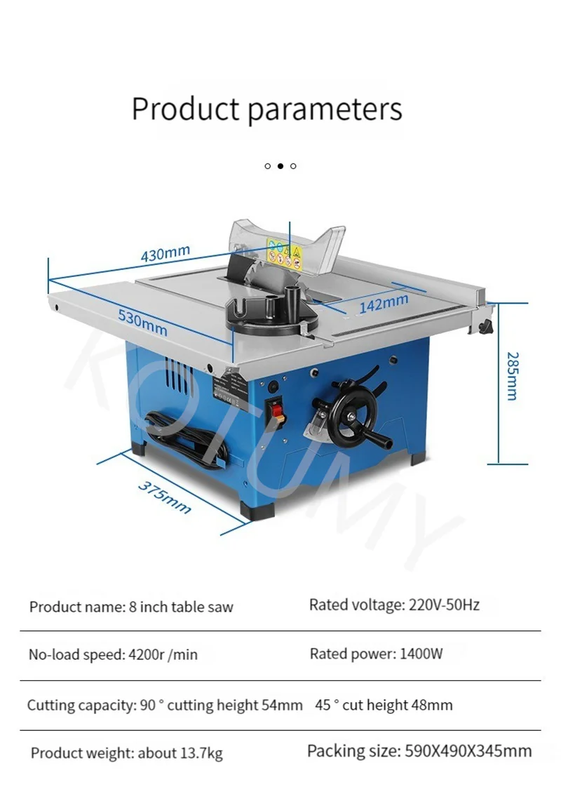 Product Name: 8-inch Table Saw Product model: HK-210B Voltage frequency: 220V/50Hz Rated power: 1400W No load speed: 4200r/min Saw blade specification: 210X25.4mm 90 ° cutting thickness: 54mm 45 ° cutting thickness: 48mm Packaging size: 590X490X345mm Weight: 14kg