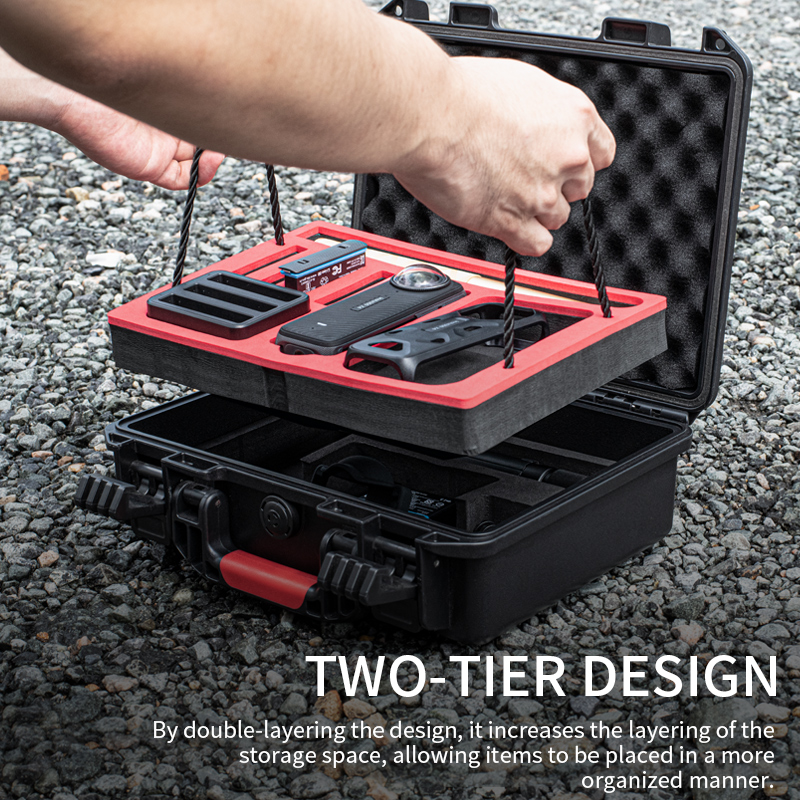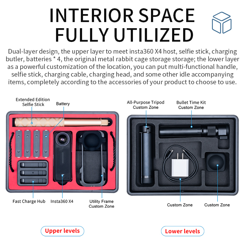 1. Large capacity storage. Double layered design, the upper layer meets the storage needs of the Insta360 X4 host, selfie stick, charging manager, battery * 4, and original metal rabbit cage; As a powerful custom location, the lower layer can hold multifunctional handles, selfie sticks, charging cables, charging heads, and other casual items that come with you. You can choose to use them according to your product accessories;