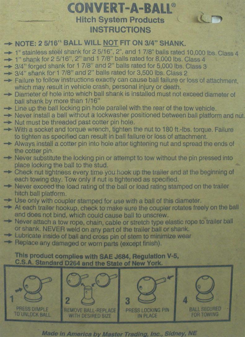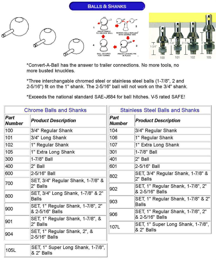 CONVERT-A-BALL 903 Trailer ball Your answer to multi-need trailer connections No more wrenches, no more busted knuckles Two interchangeable balls (1 7/8", 2", fit on the 1" shank Safety hole drilled for cotter pin Stress-proof slide pin with shear #903 - 2 Ball Set 1" Shank - Stainless Steel - 1 7/8", 2" balls |
