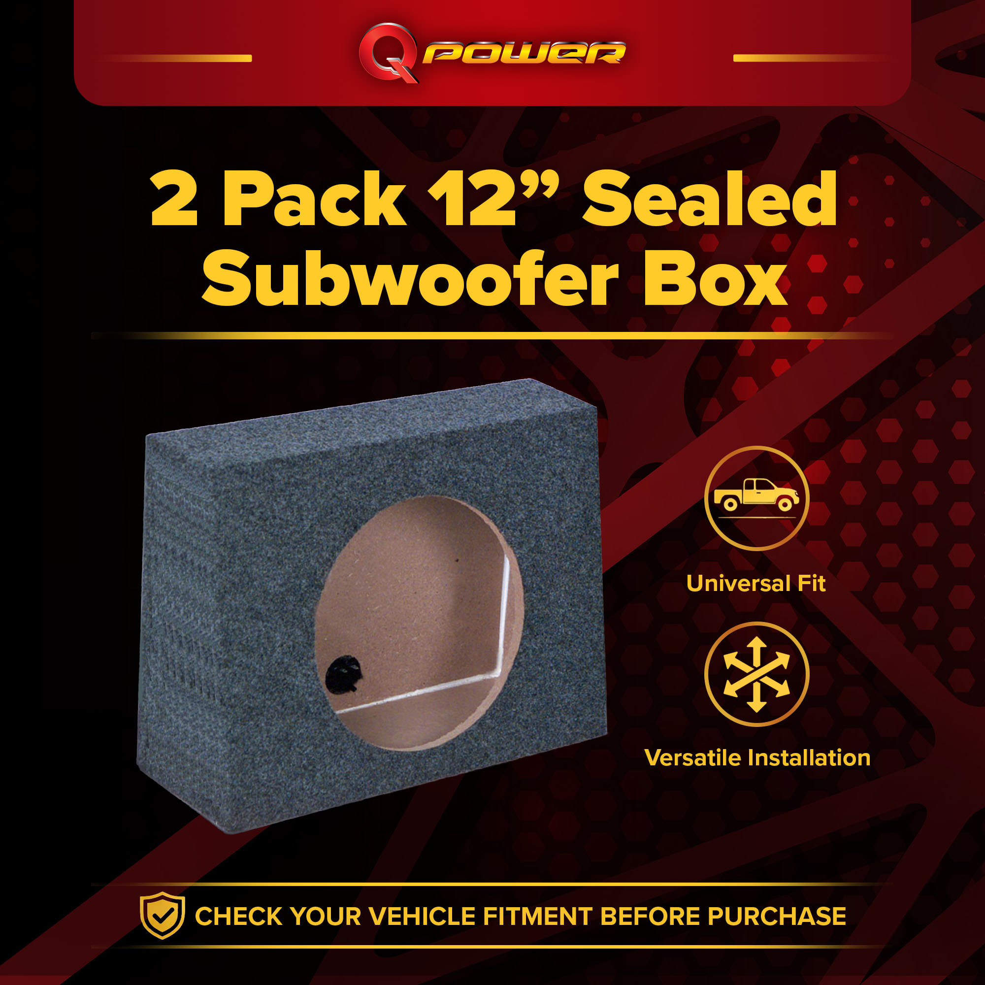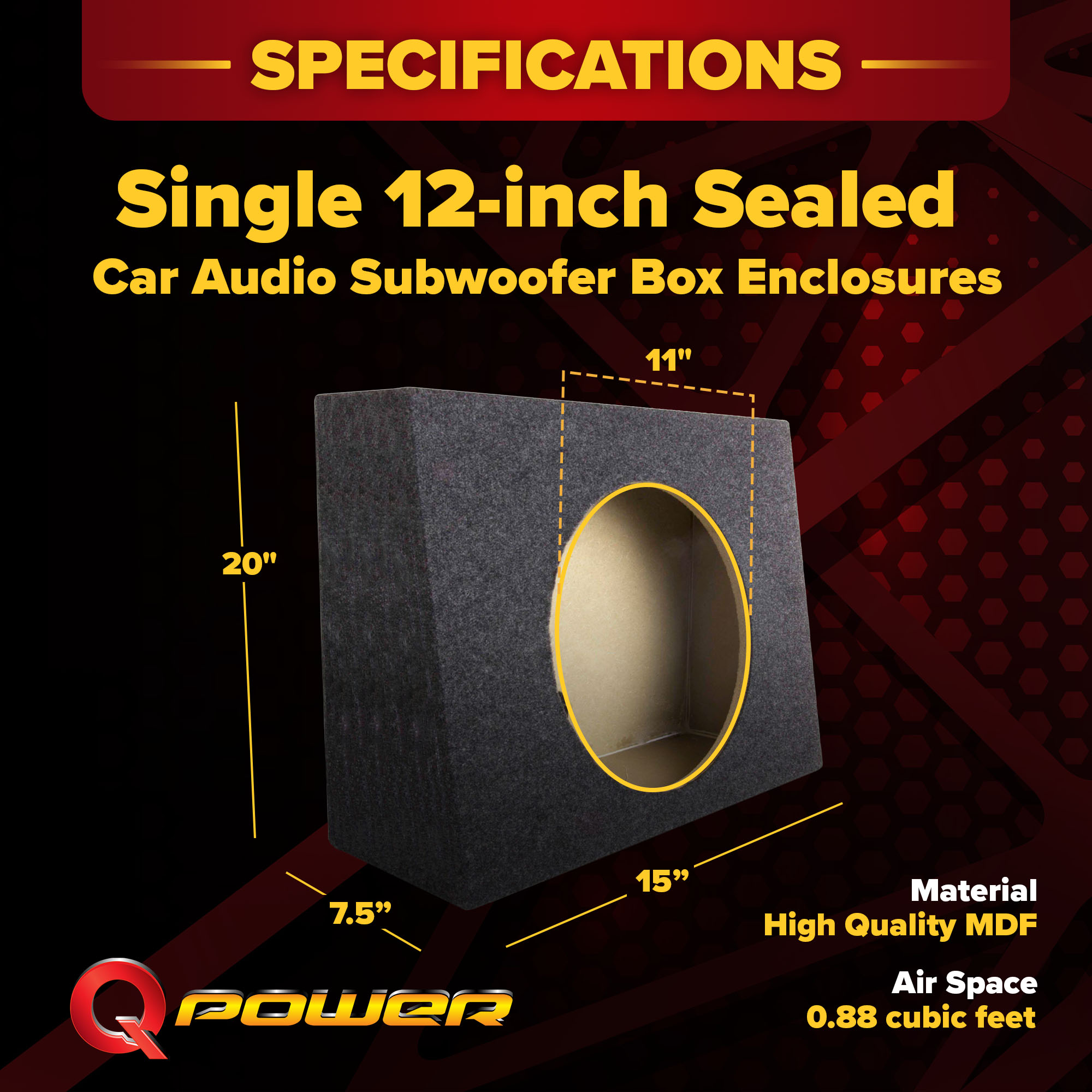 These 2 Q-Power QTW12 Single 12-inch Sealed Car Audio Subwoofer Box Enclosures feature solid 5/8-inch MDF construction, charcoal carpet covering, terminal cup connectors, 0.88 cubic feet of air space per Box, and a mounting depth of 5.5 inches. Turn your ride into a sound machine with the help of the Q Power QTW12 Single 12-Inch Sealed Car Audio Subwoofer Sub Box Enclosures!