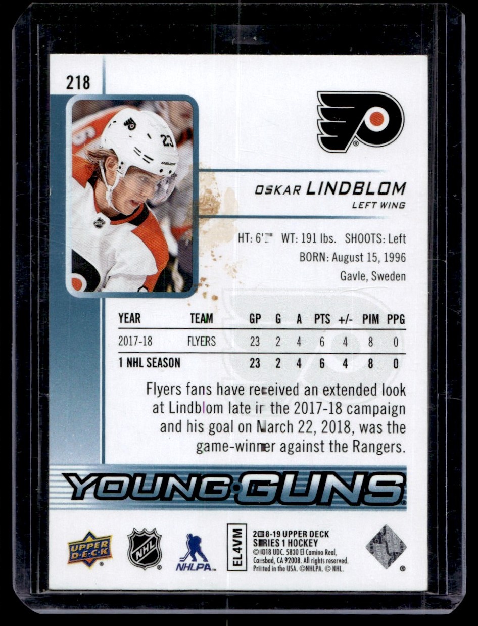 | 2018-19 Upper Deck Young Guns Oskar Lindblom Rookie Philadelphia Flyers #218 | ||||||||||||||||||