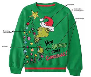 - Screenprint, Chenille Applique, Embroidery, Plush, Flocking on Themed Print (see photo)