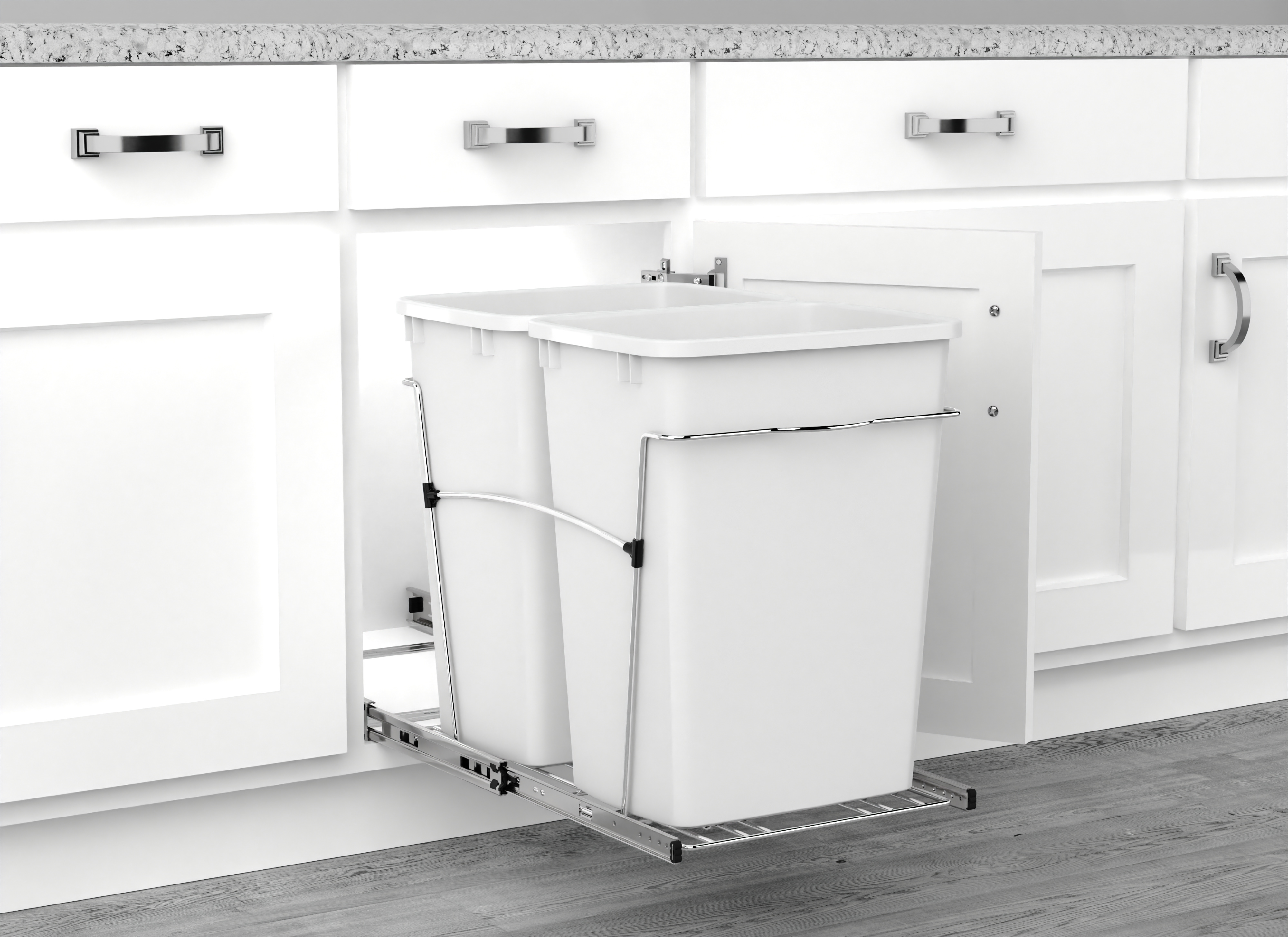 Once installation is complete, these sliding trash containers glide effortlessly on a 3-piece zinc plated full-extension ball-bearing slide system. These two pullout bins use standard 12-gallon trash bags. Designed for a base cabinet with an opening width of 14.5”- 18”. The heavy gage metal wire construction ensures that this pullout system will last for years to come.